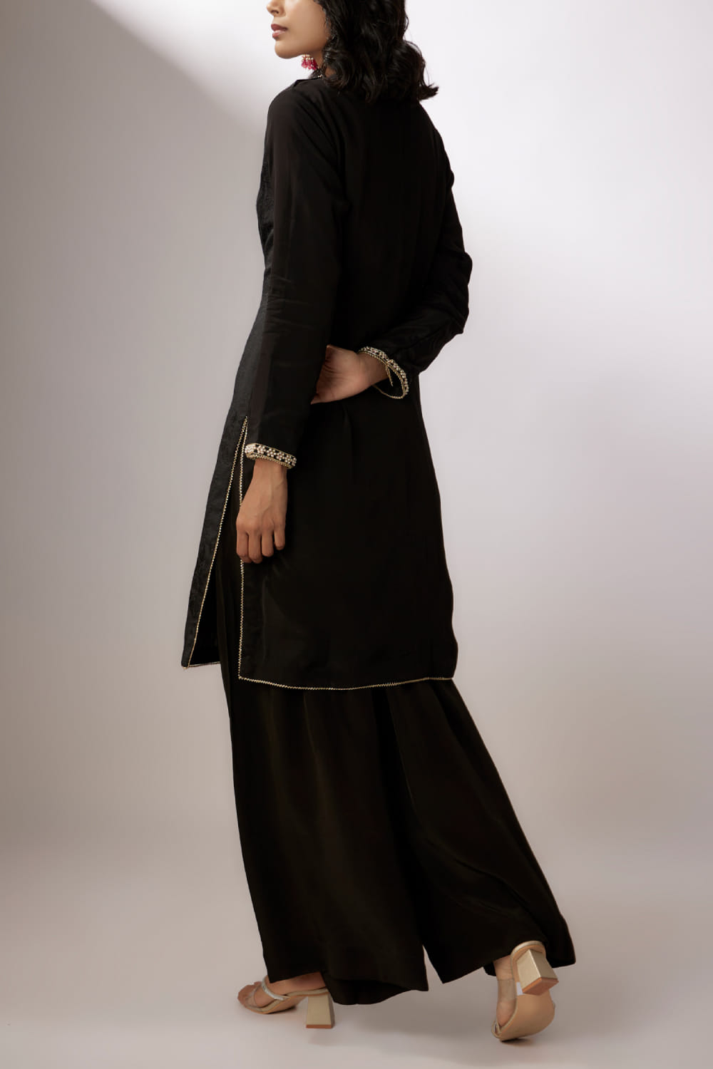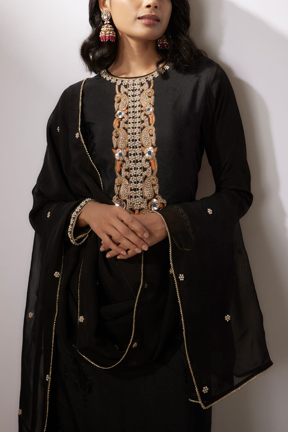 Nadima Saqib designs this occasion-ready kurta in silk encapsulated with delicate pearls and zardozi embroidery in floral and paisley patterns, teaming it with matching wide-leg pants and a matching dupatta. Style the look with kundan earrings and embellished wedges.