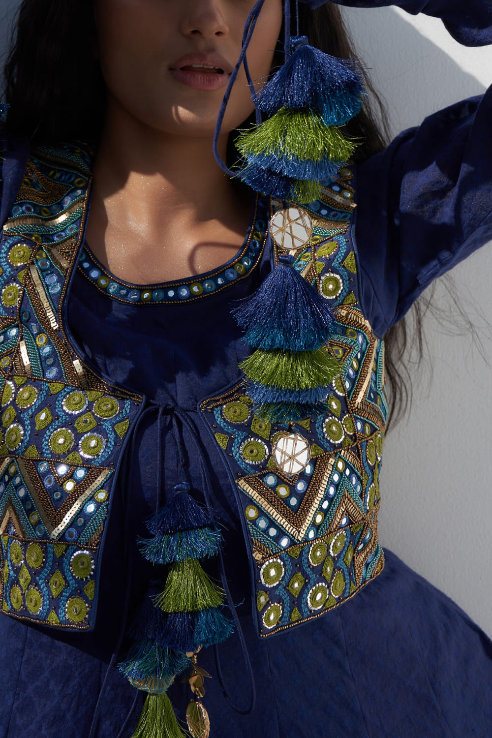 Nadima Saqib designs this dazzling short and sleeveless jacket crafted in silk with dori, zardozi, beads and mirror embroidery detailing featuring a tie-up with tassel detailing. Style it with a woven kurta and sharara for a distinctive look.