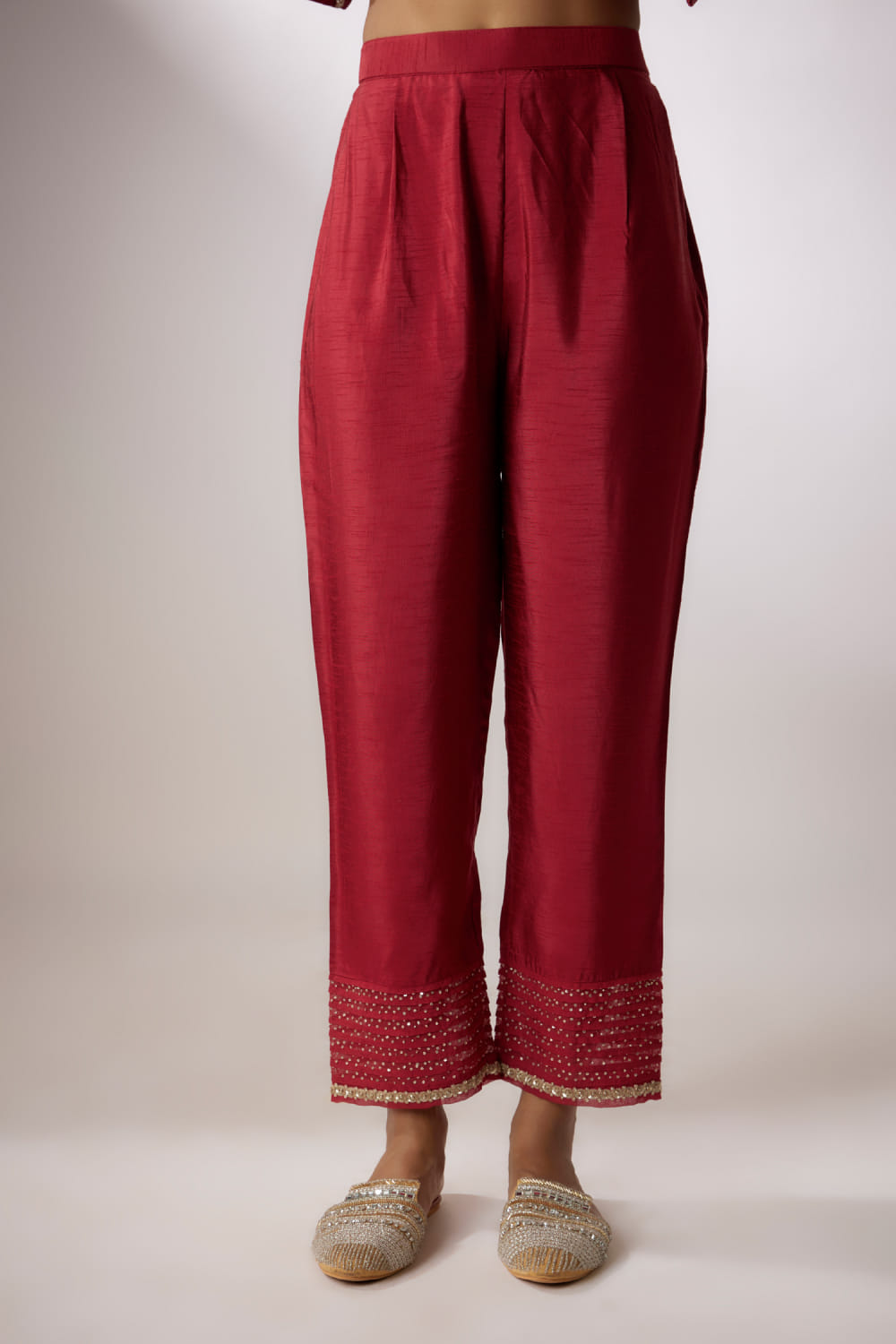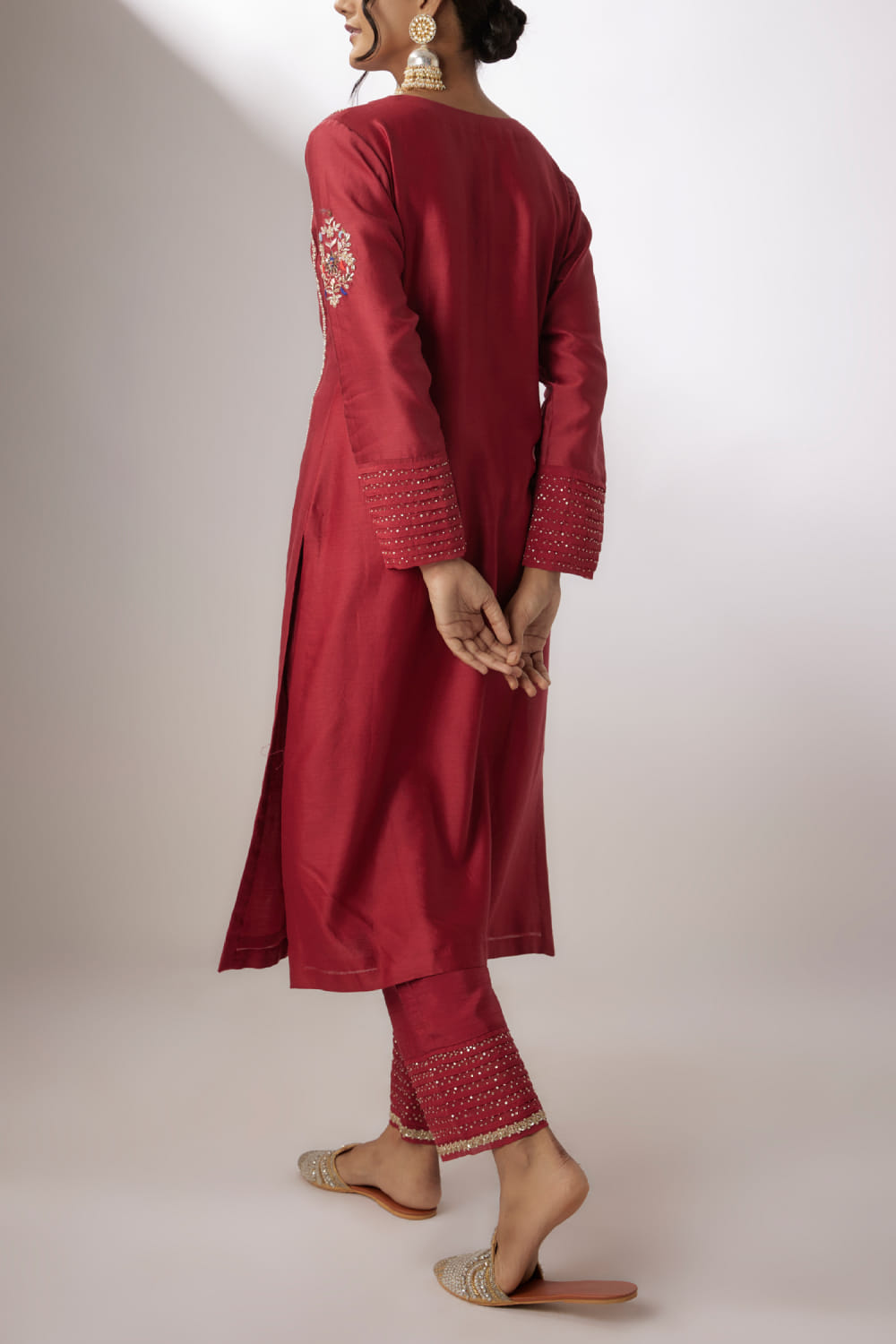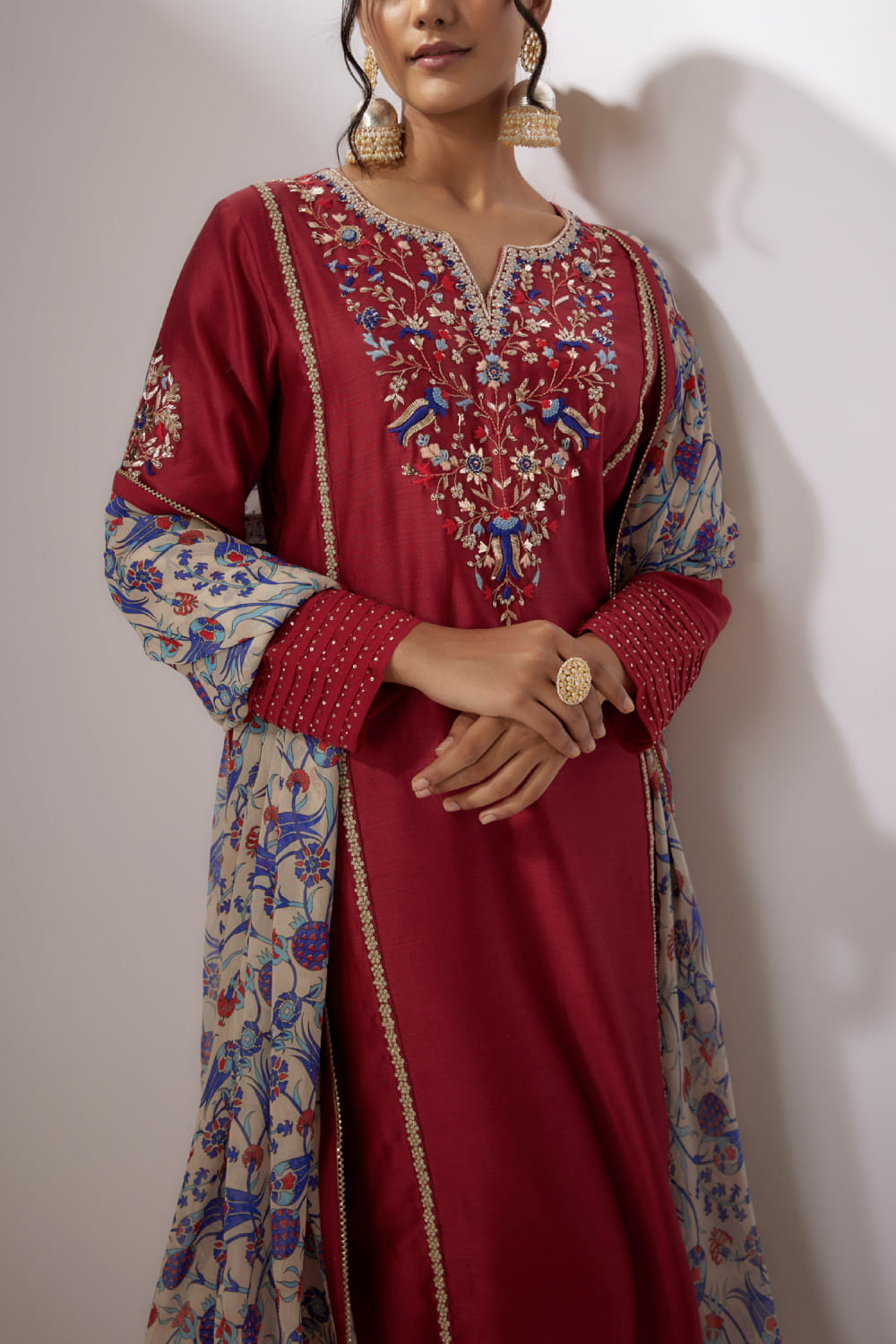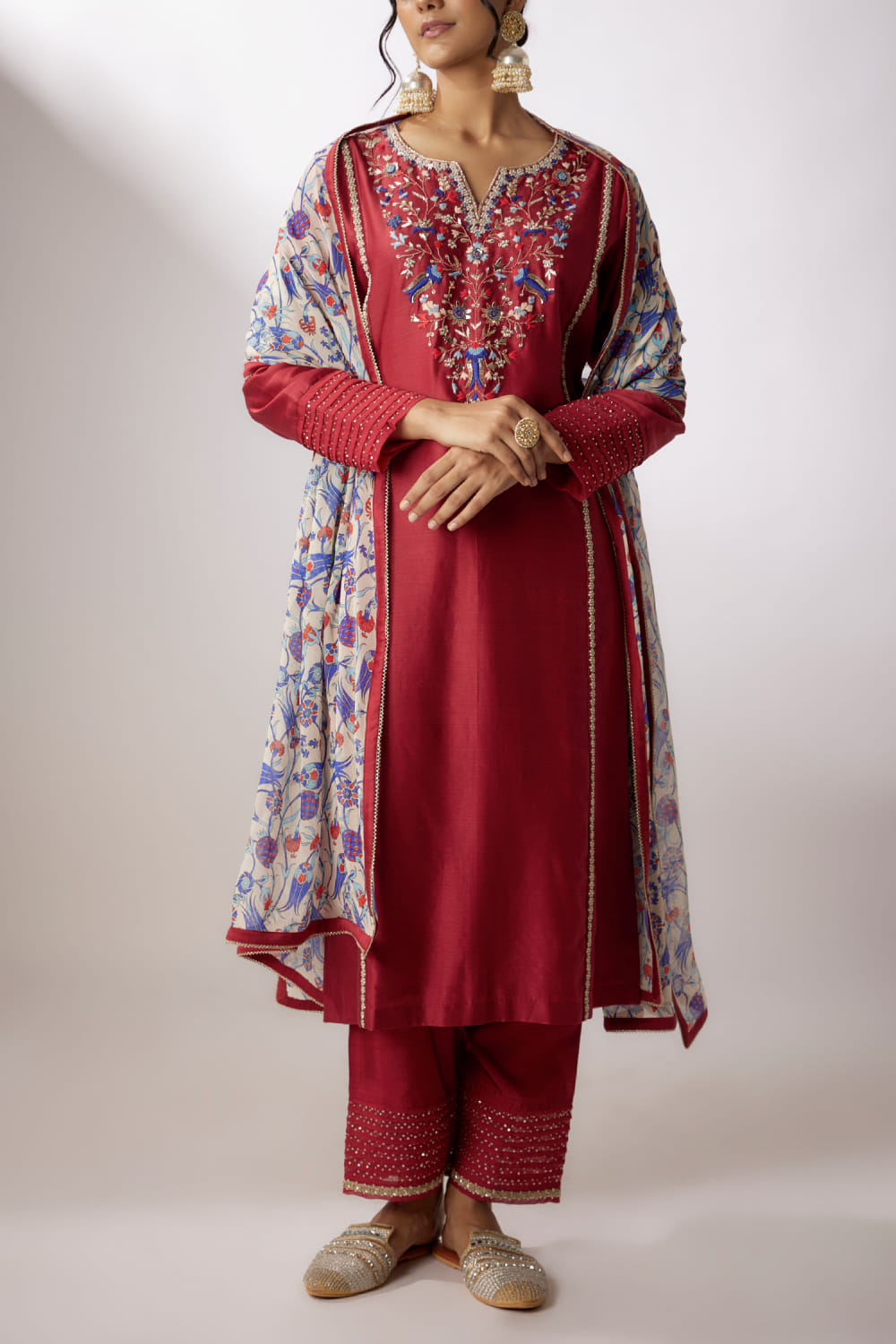 Nadima Saqib designs this distinctive kurta in chanderi enriched with zardozi embroidery detailing in intricate floral patterns featuring dainty pearls and sequins, complementing it with matching straight pants and a printed dupatta. Style the look with polki earrings and a potli bag.