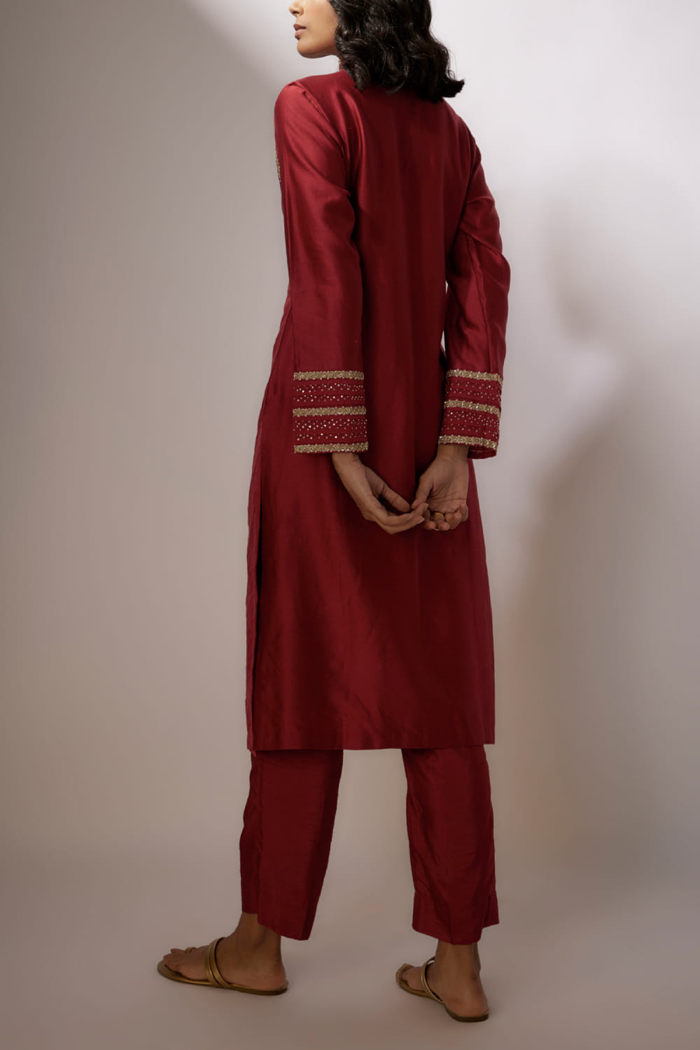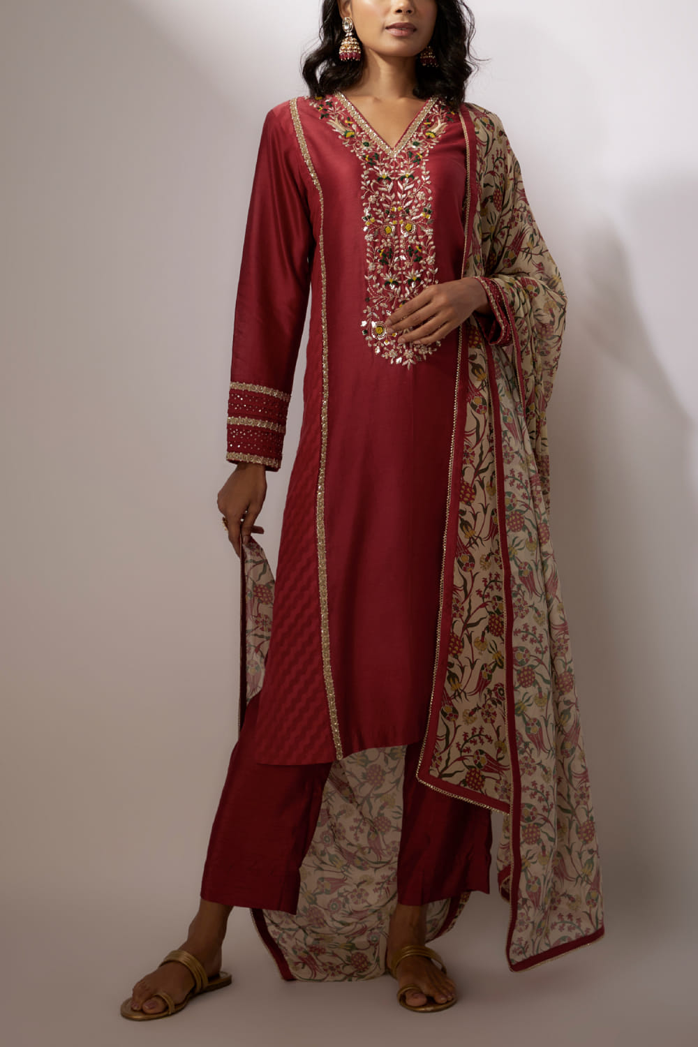 Nadima Saqib designs this timeless kurta crafted in chanderi with zardozi embroidery detailing in intricate floral patterns, complementing it with matching straight pants and a printed dupatta. Style the look with floral earrings and mules for a classic update.
