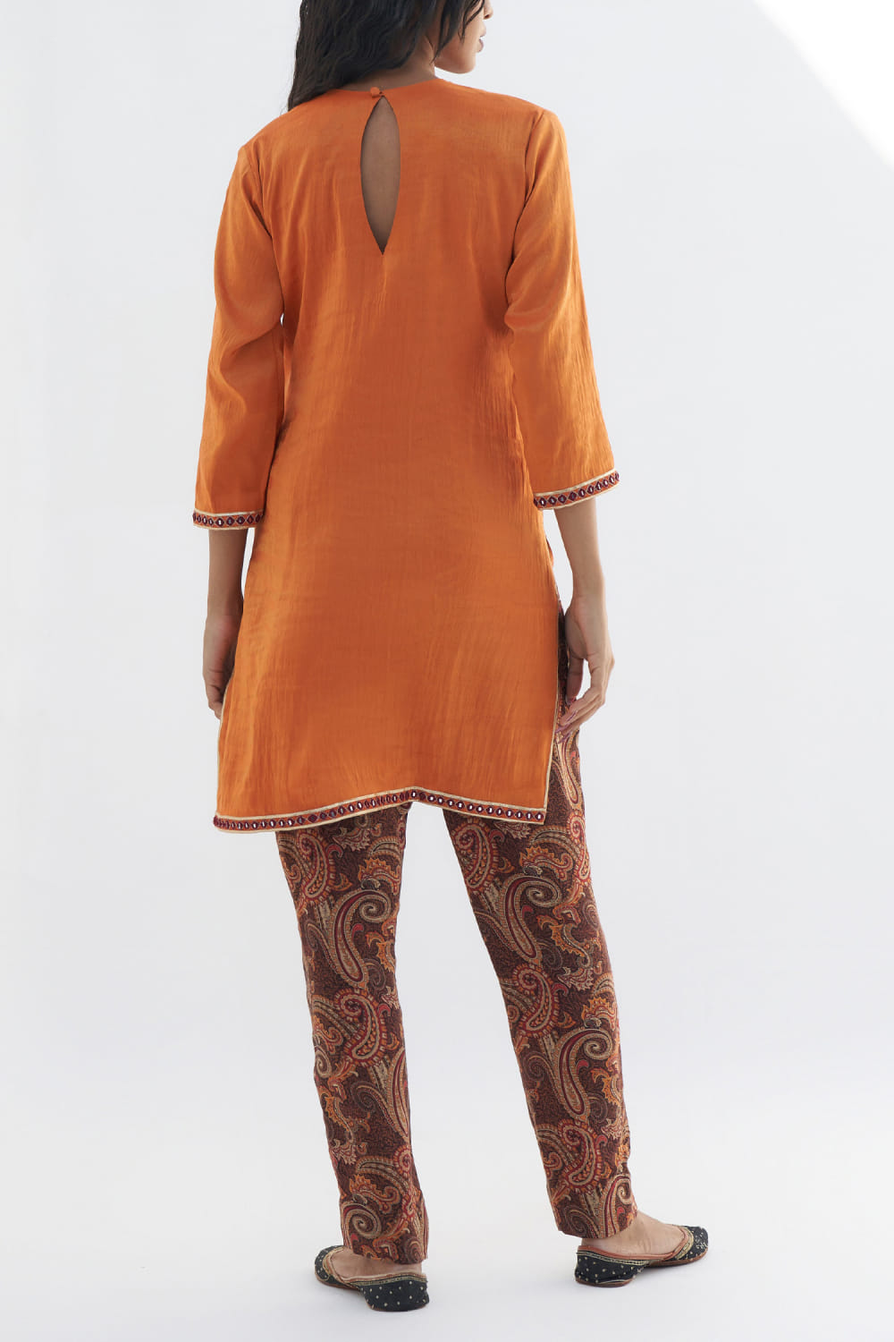 Nadima Saqib presents this vibrant orange tissue knee-length kurta adorned with mirror work embroidered yoke featuring resham and zari detailing, creating an exquisite ethnic ensemble. Complete the outfit with statement earrings to enhance the overall appeal. The pants here are shown for styling purposes only.