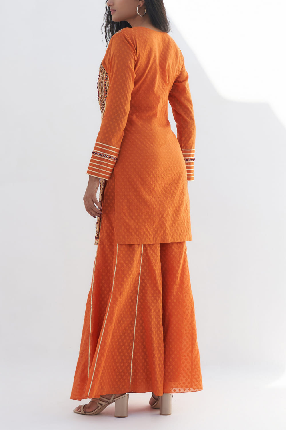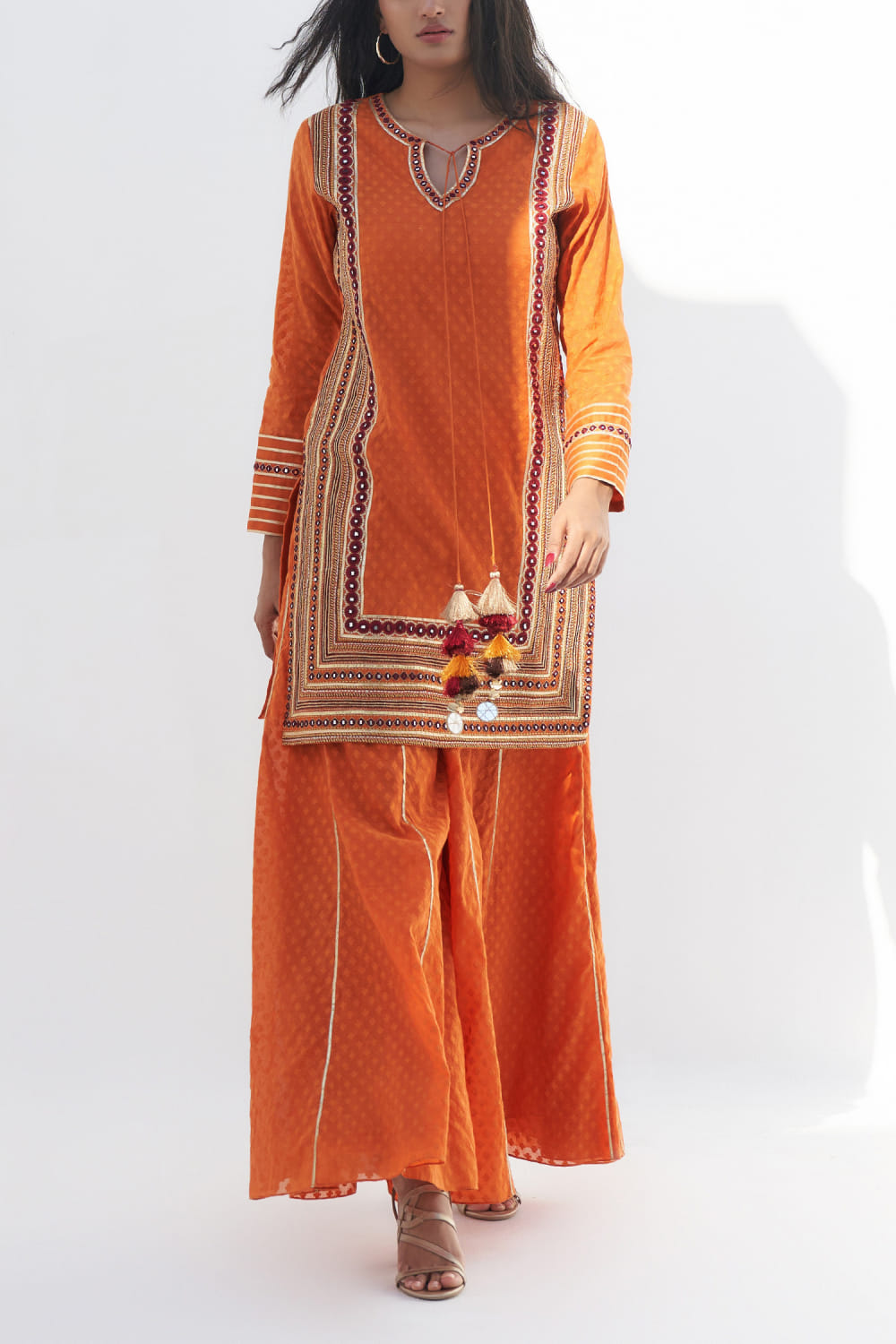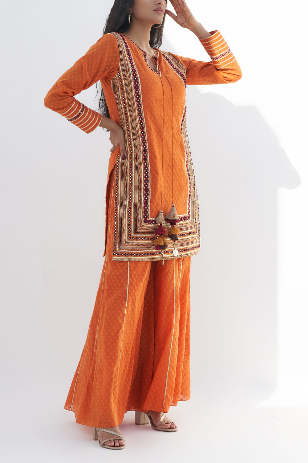 Nadima Saqib presents this festive-ready orange chanderi jacquard short kurta, adorned with mirror work embroidery and playful tassels featuring resham and zari detailing. Pair it with fitted palazzo pants for a chic and contemporary look. The pants here are shown for styling purposes only.