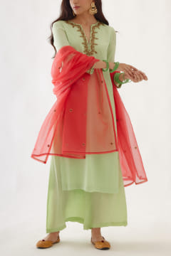 Nikasha designs this opulent handwoven straight kurta embraced in viscose crepe with dabka embroidery and sequin embellishments on the neckline and sleeves, teaming it with a pair of matching pants and a contrast embellished viscose organza dupatta. Style the look with embellished jhumkas and wedges for pre-wedding functions.