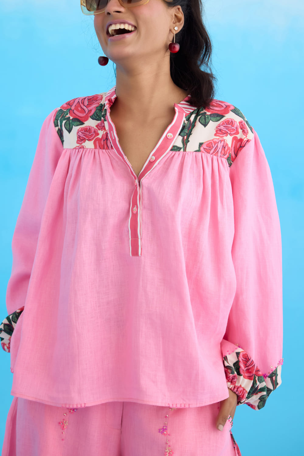 Nikasha designs this charming top embraced in cotton with rose prints and bubble sleeves featuring a gathered back, button placket and hand-stitch detailing. Style it with matching pants and wedges for a casual appeal. The pants here are shown for styling purposes only.