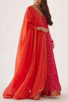 Nikasha designs an artisanal look with this straight dabka embroidered kurta and gota lace accented lehenga crafted in viscose crepe with bandhani prints, complementing it with an embellished viscose organza dupatta. Style the look with a kundan polki embellished necklace and embroidered juttis for a wedding statement.