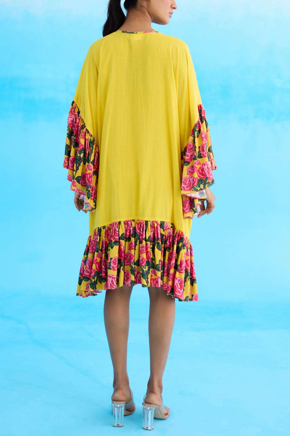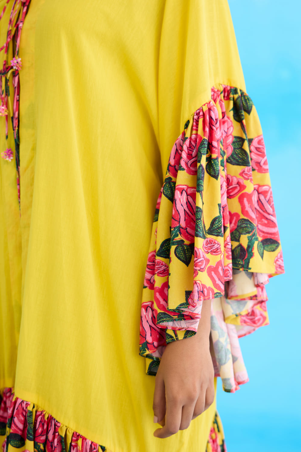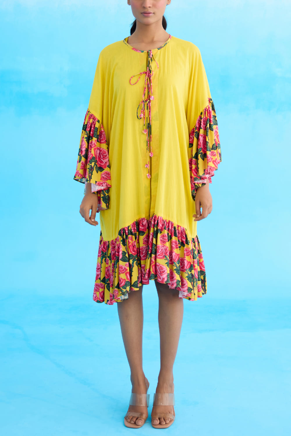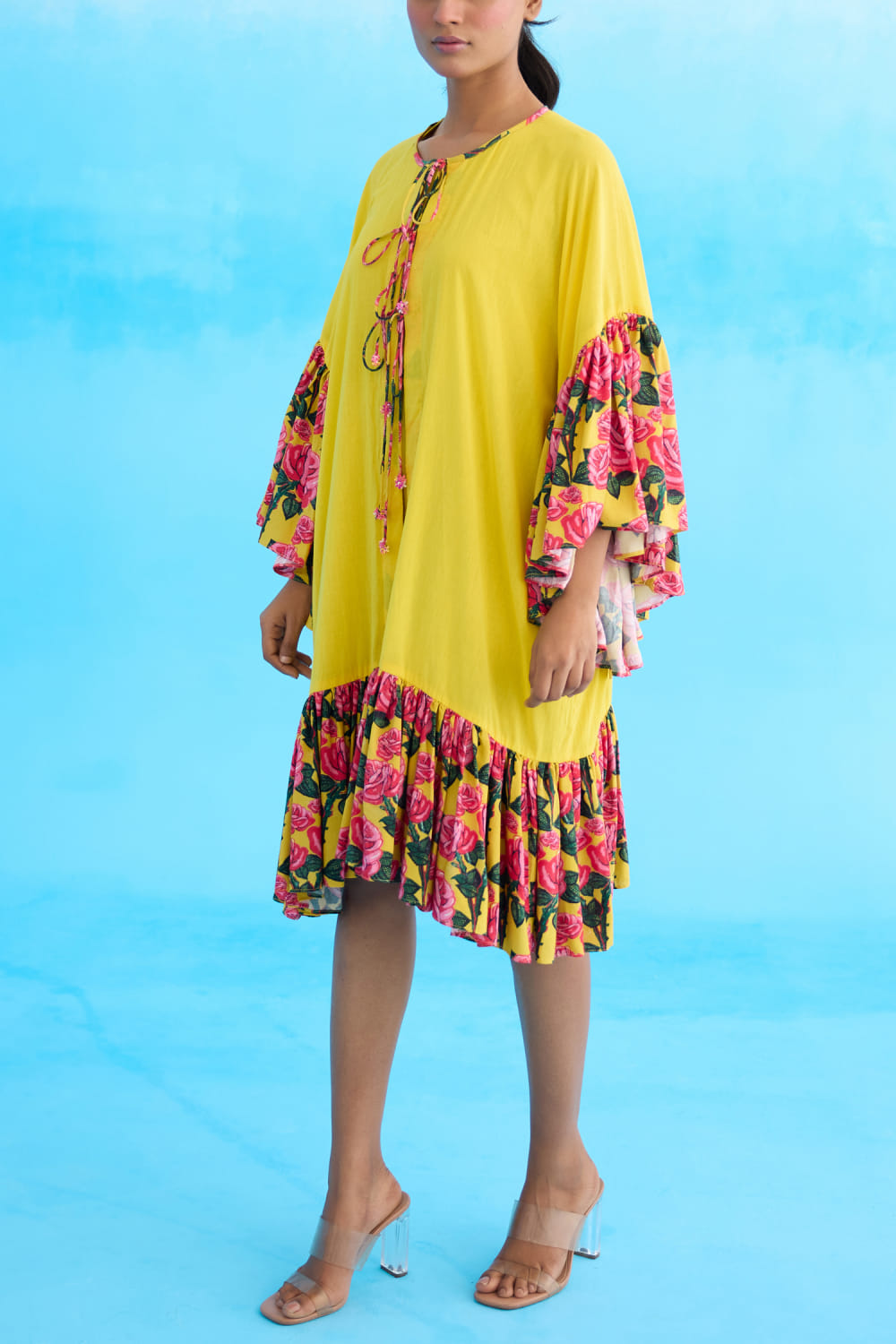 Nikasha designs this alluring dress rendered in cotton with rose prints, stylised sleeves and tie-up tassel accents featuring gathered detailing in a high-low silhouette. Style the look with a box clutch and strappy heels for a trendy update.