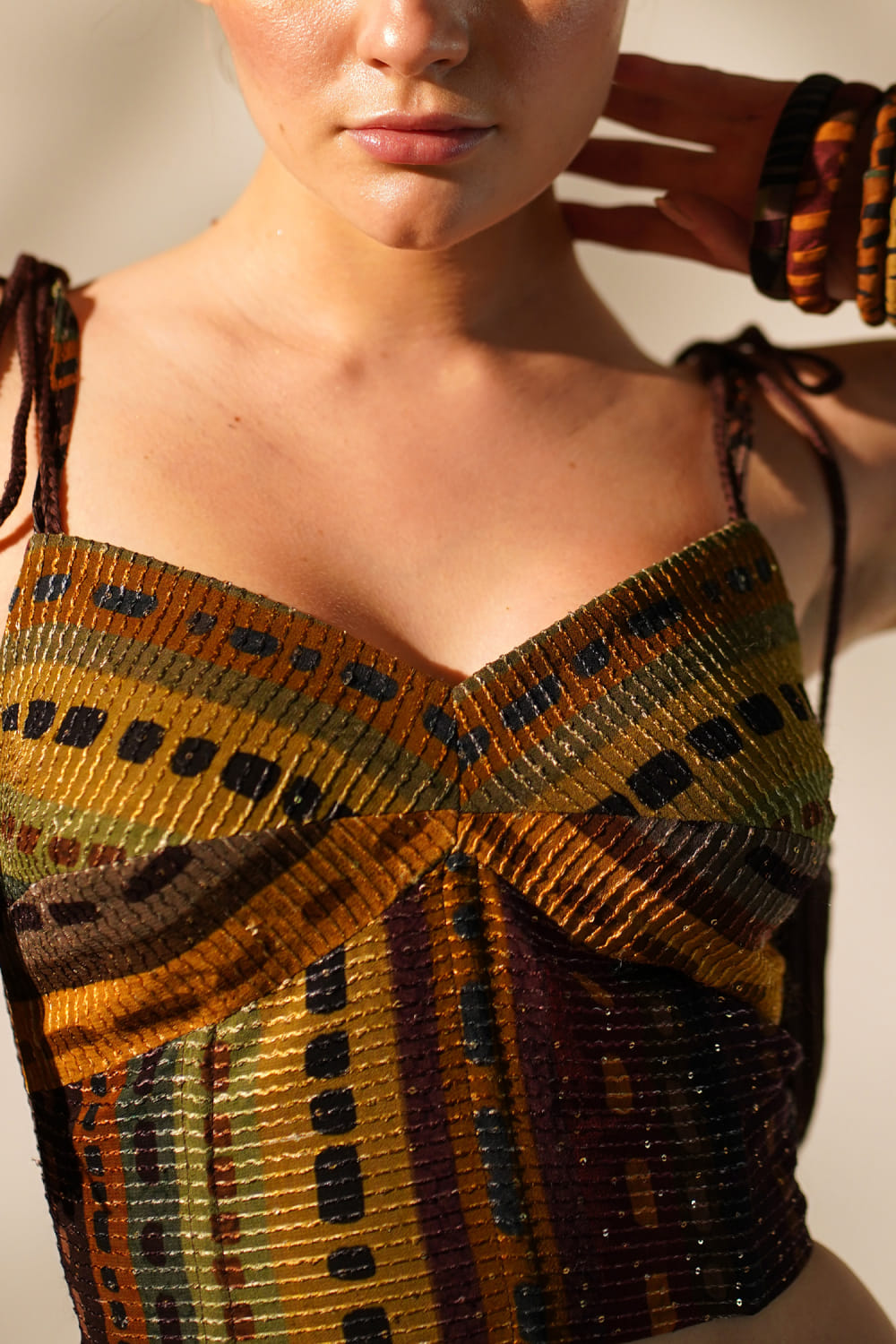 Nikita Mhaisalkar designs this exquisite top with stripe print rendered on sequin embellished georgette fabric. Style it with a pair of shorts and skirt to make a statement. The skirt is shown for styling purpose only.