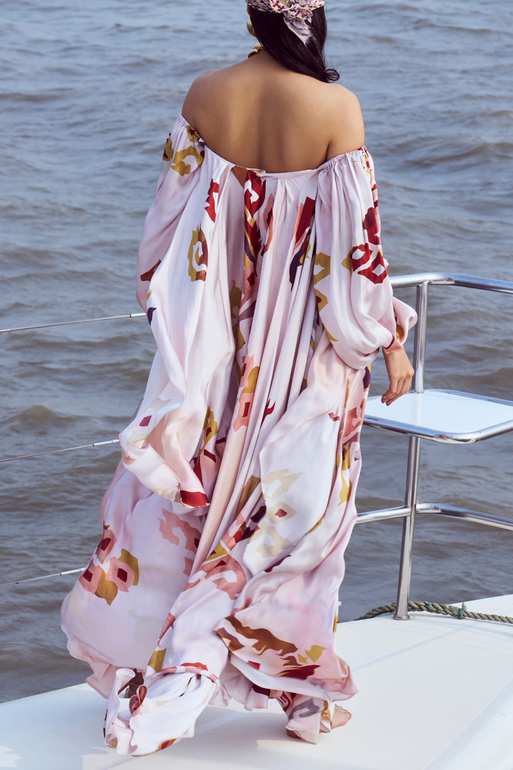 Nirmooha designs this distinctive pair of flared pants rendered in modal satin with artsy prints. Style it with a crop top and sneakers. The tunic here is shown for styling purposes only.