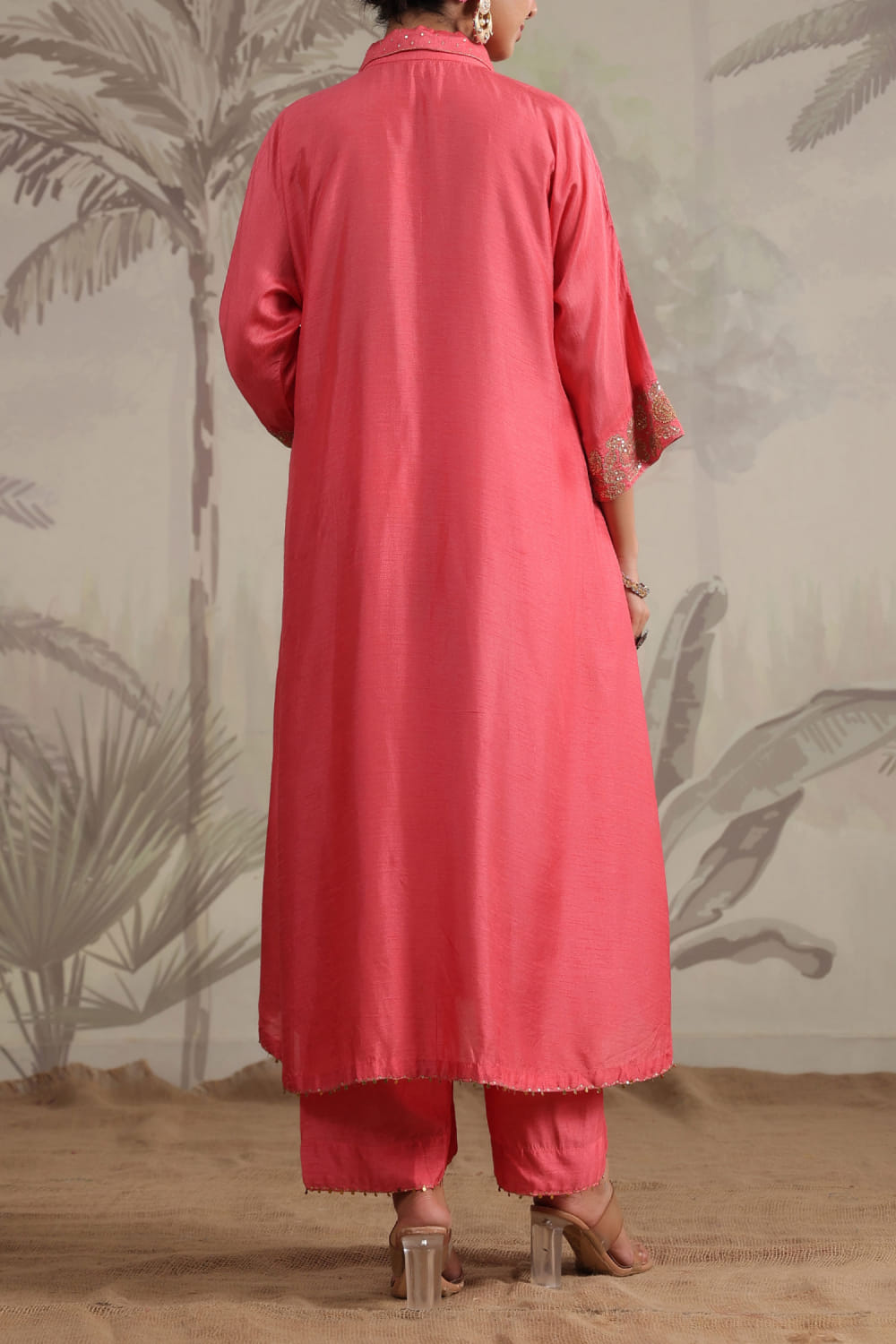 Niti Bothra designs this opulent shirt-style kurta customised in silk with a collar, sequins, dainty pearls and zardozi hand embroidery detailing in floral patterns, teaming it with matching palazzo. Style the look with an embroidered clutch and block heels for a distinctive appeal.