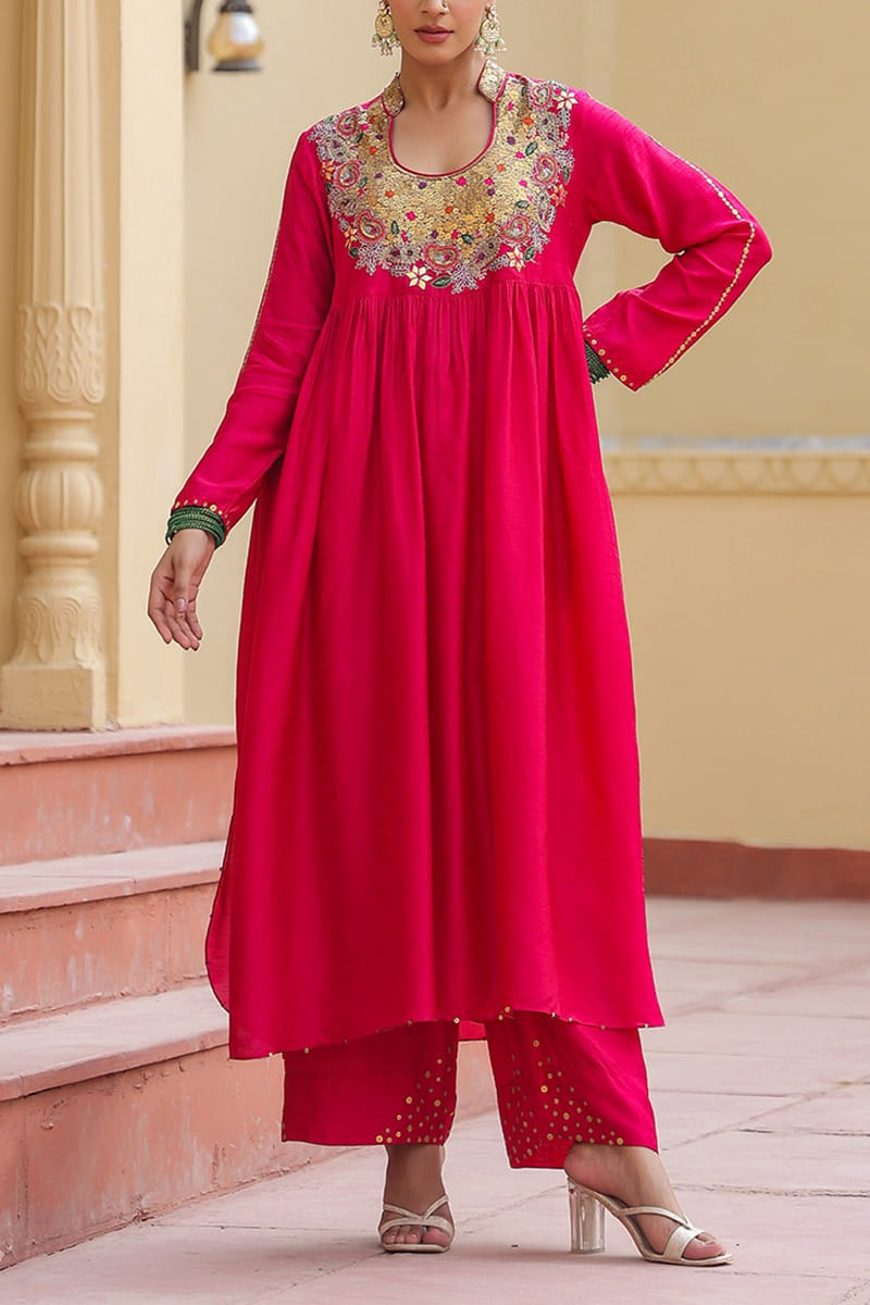 Niti Bothra designs this bright and breezy kurta with embroidered pockets and an embroidered neckline featuring zardozi, paatra tikkis, kasab, resham and gota patti work in paisley and floral patterns. It is paired with palazzos. Style the look with an embroidered potli bag and chandbaalis for a festive soiree. The dupatta here is shown for styling purposes only.