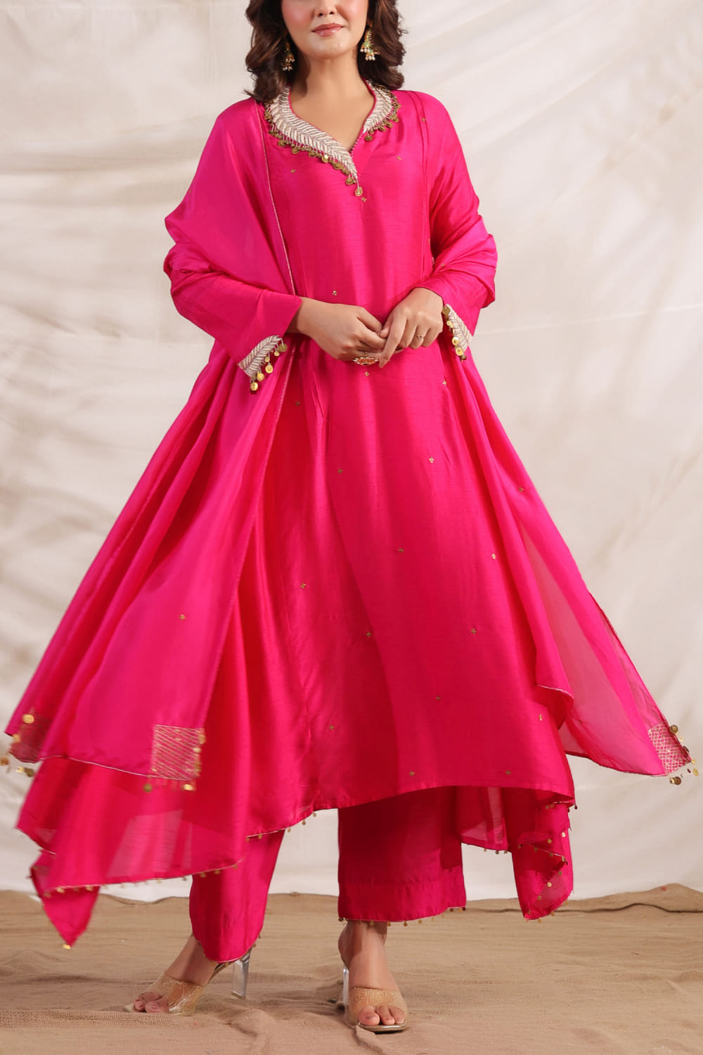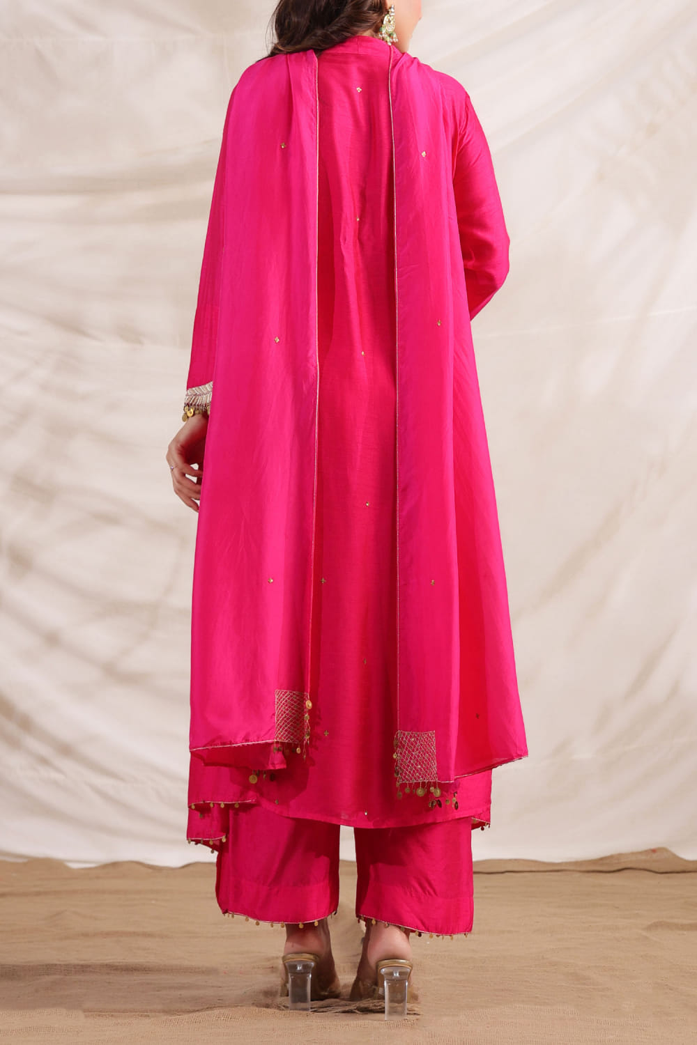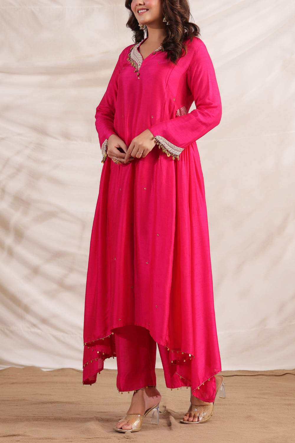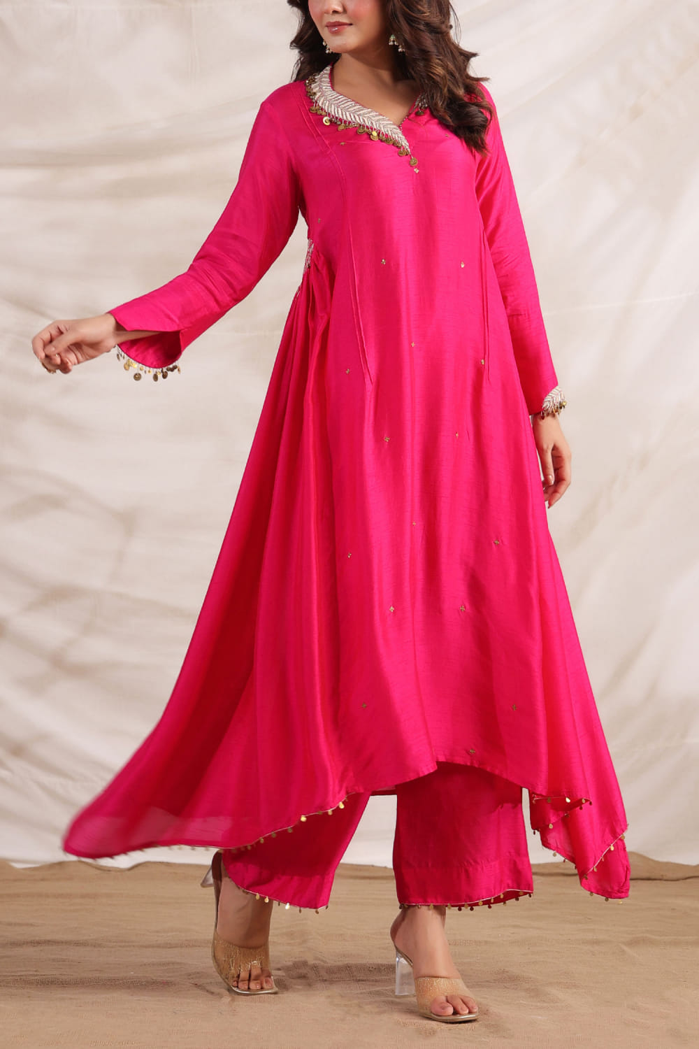 Niti Bothra designs this captivating kurta in silk encapsulated with side gathered detailing and zardozi embroidery featuring sequin tassels in an asymmetrical silhouette, teaming it with matching pants. Style the look with an embellished ring and a potli bag. The dupatta here is shown for styling purposes only.