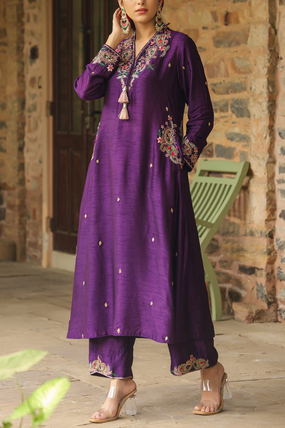 Niti Bothra designs this effortlessly charming kurta with resham, zardozi, zari and gota embroidery in motifs and paisley patterns. It is teamed with paisley-bordered palazzos. Complement the look with a pair of kundan danglers and anklets. The dupatta here is shown for styling purposes only.