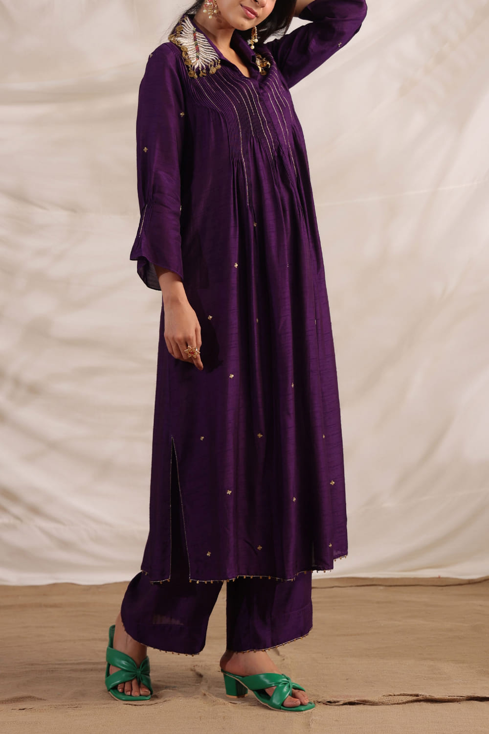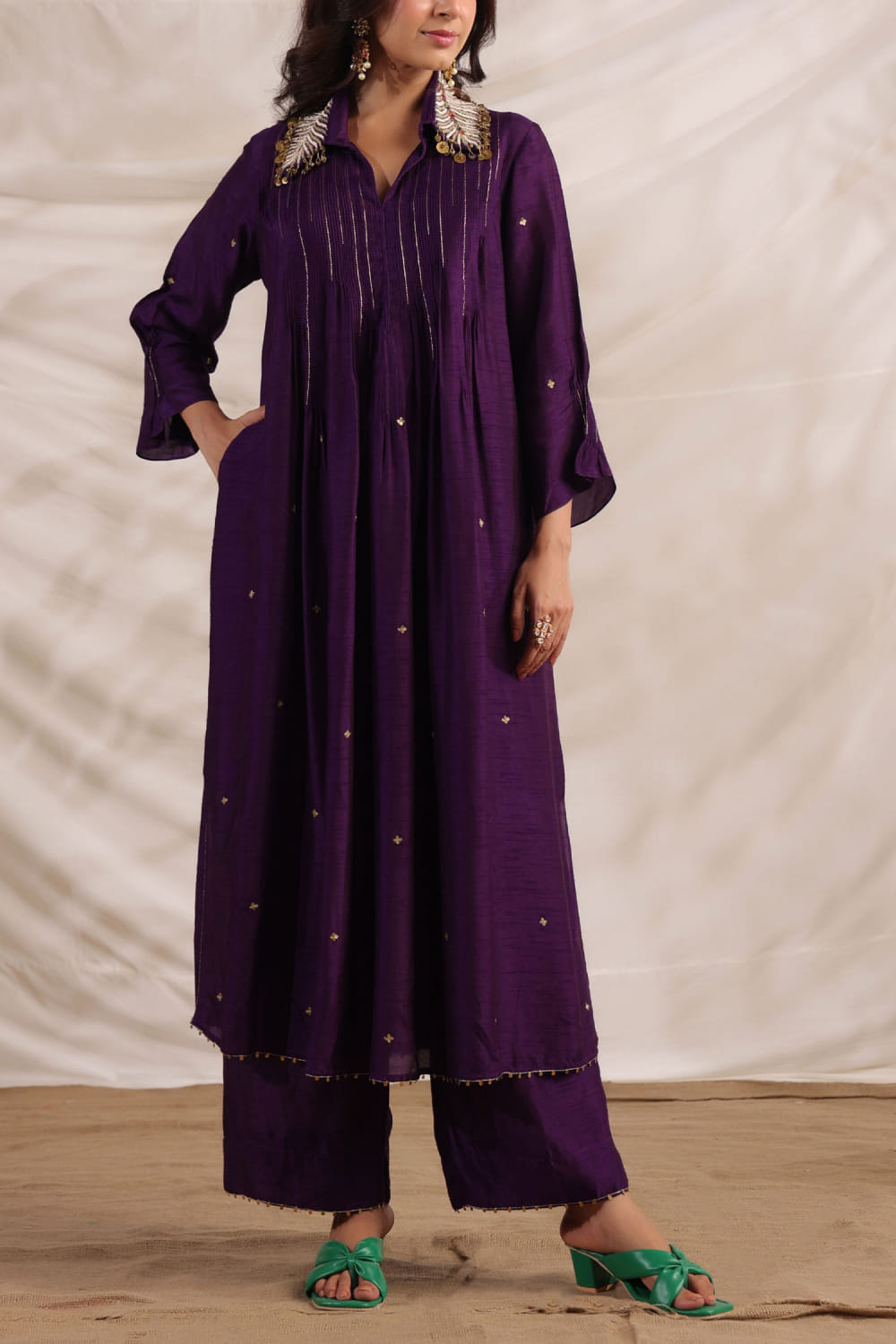 Niti Bothra designs this statement-making shirt-style kurta in silk enriched with motif embroidery, pintuck detailing and a zardozi embroidered collar featuring sequin tassels, teaming it with matching pants. Style the look with a belt and sneaker wedges for a modern update.