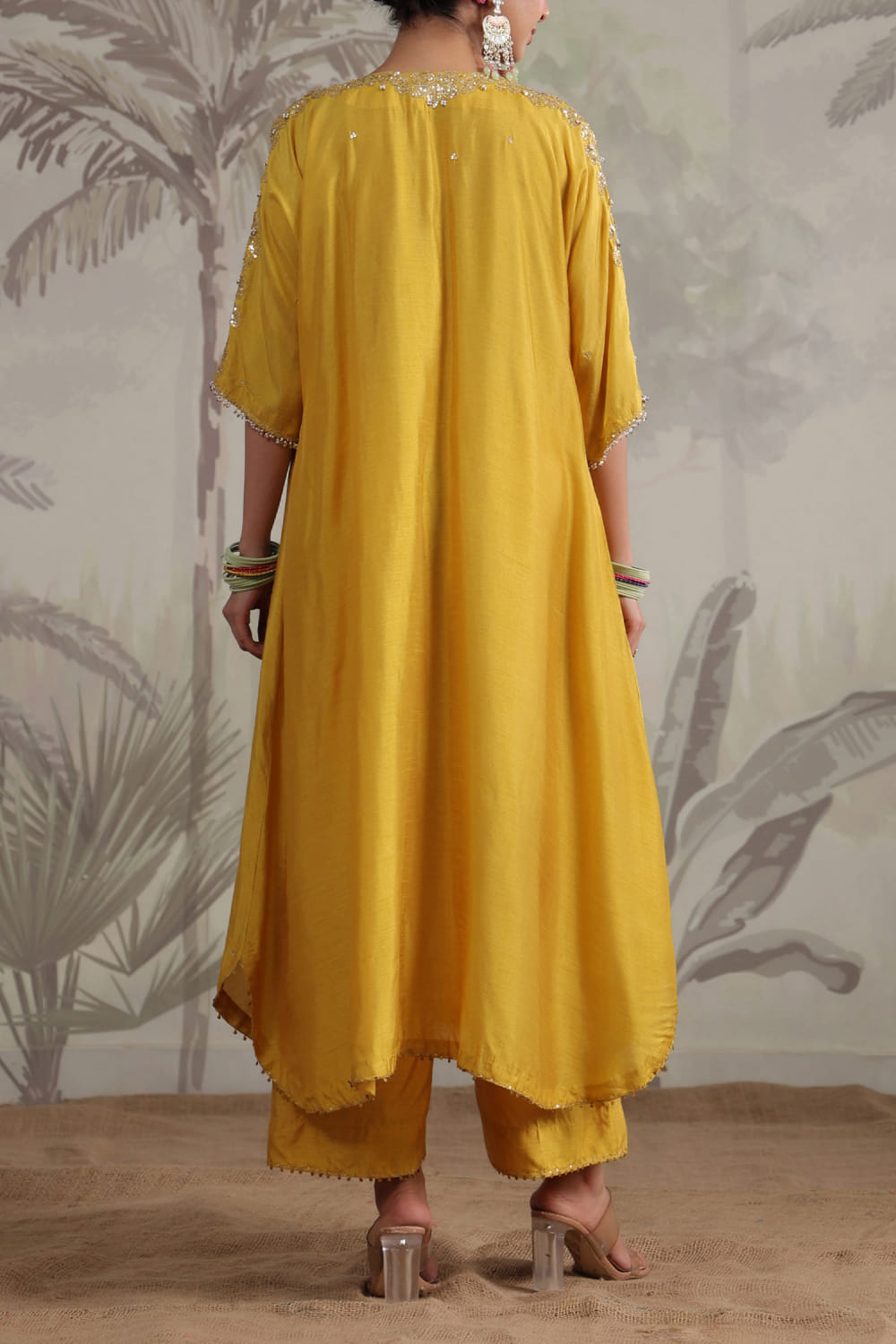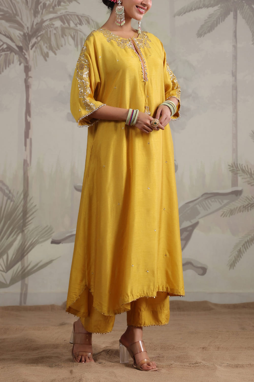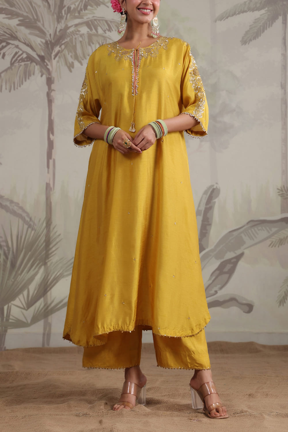 Niti Bothra designs this festive-ready kurta in silk enriched with sequins, dainty pearls and zardozi hand embroidery detailing in floral patterns featuring neck tie-up detailing with pearl tassels, complementing it with matching palazzo. Style the look with polki earrings and an embellished ring for a striking impression. The dupatta here is shown for styling purposes only.