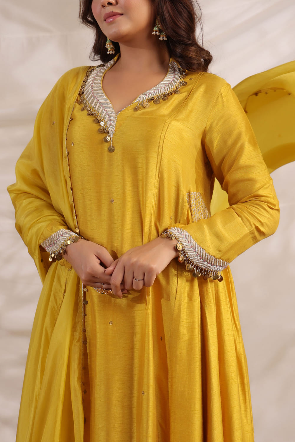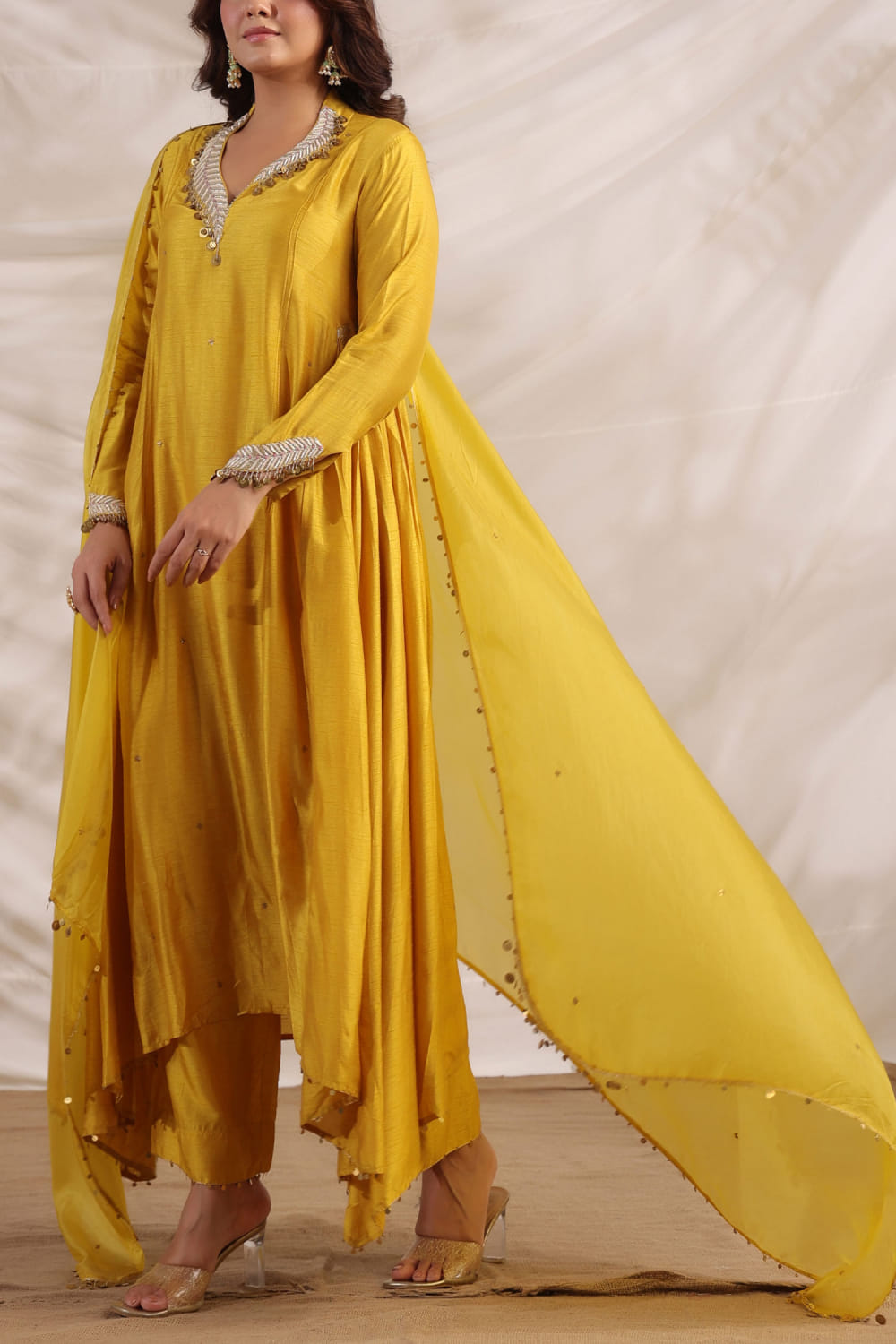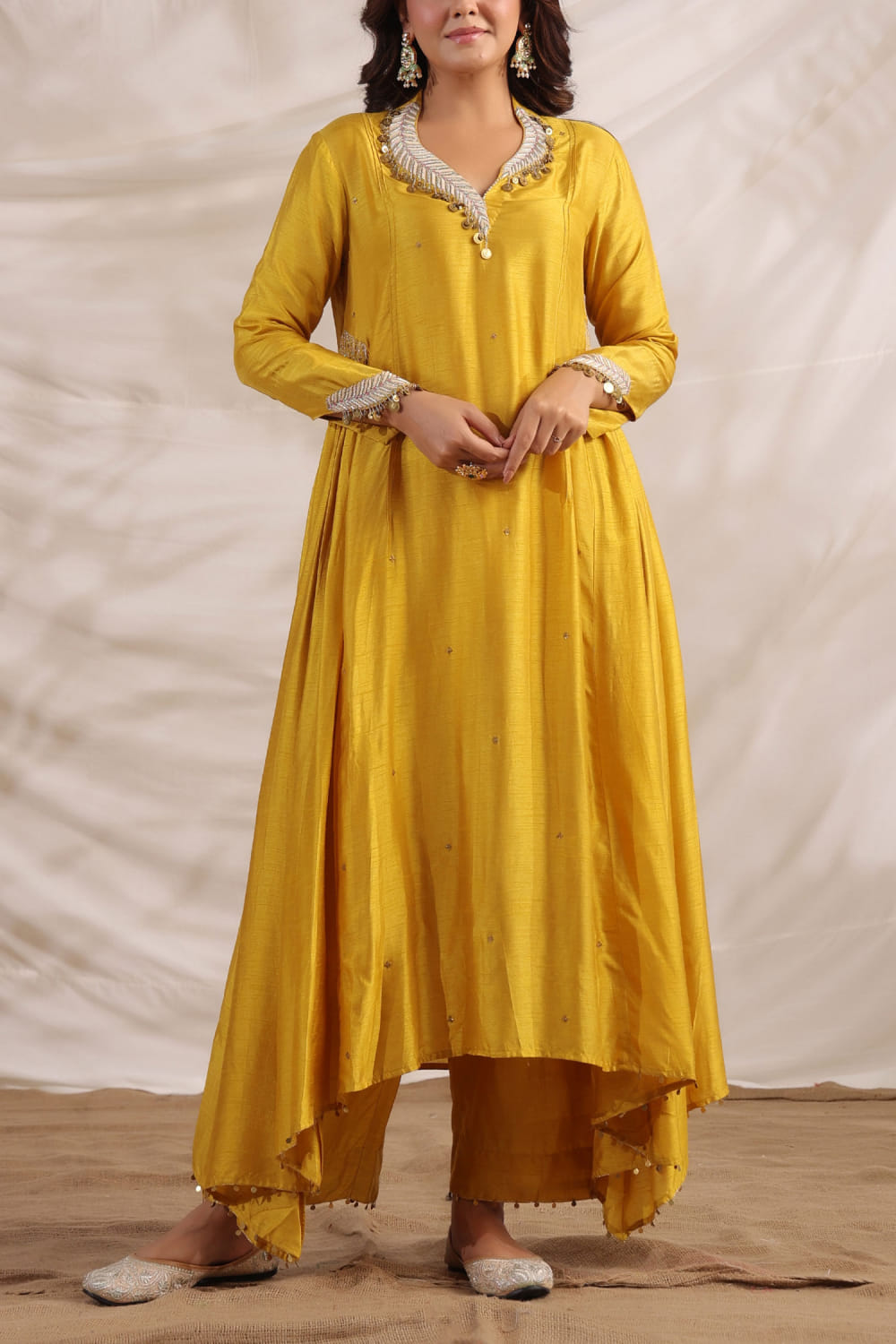 Niti Bothra designs this striking kurta customised in silk with side gathered detailing and zardozi embroidery featuring sequin tassels in an asymmetrical silhouette, pairing it with matching pants. Style the look with a dupatta and embroidered juttis for a festive affair. The dupatta here is shown for styling purposes only.
