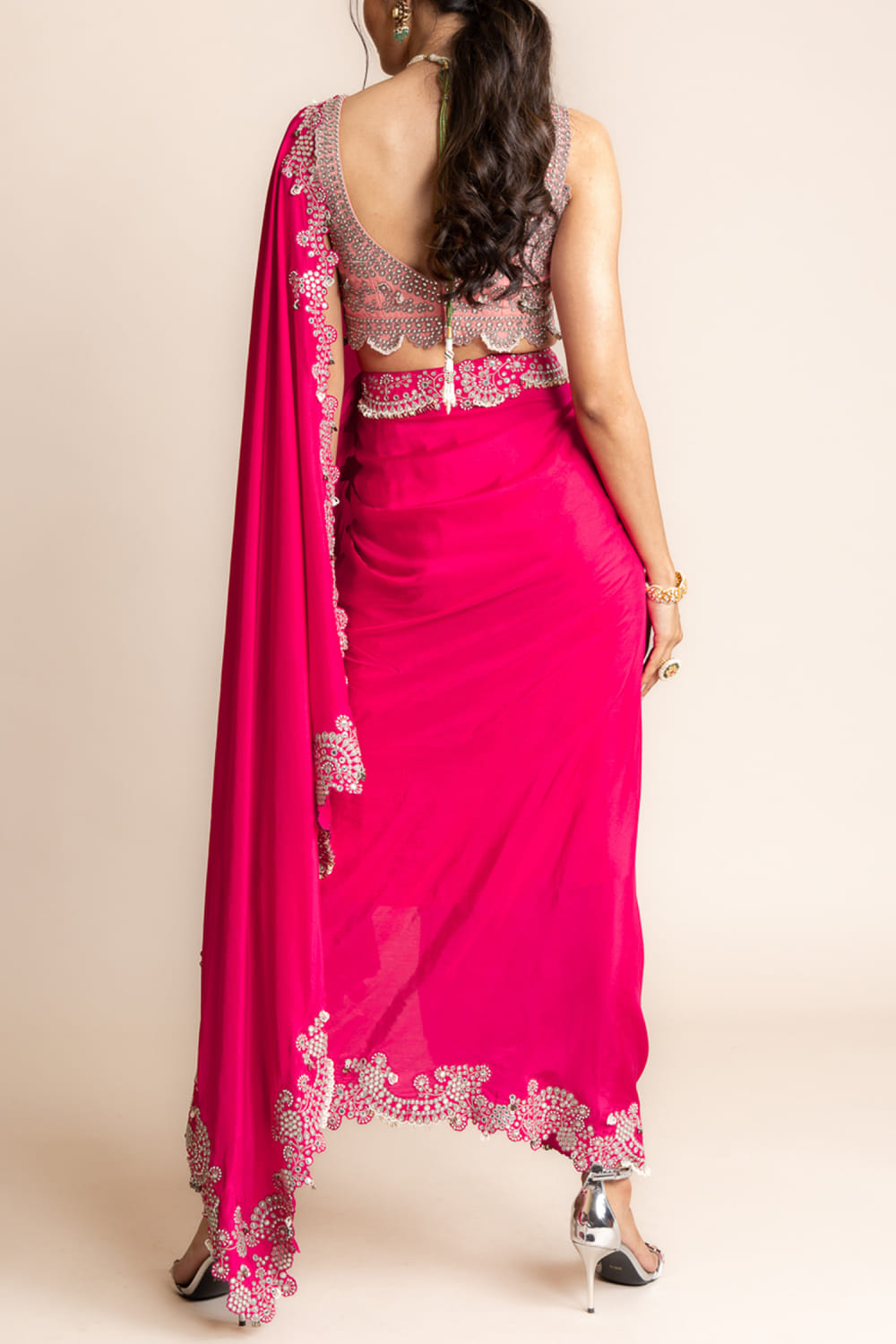 Nupur Kanoi designs this envy-inducing pre-draped sari rendered with an embellished border featuring mirror work, Swarovski embellishments, metallic sequins, stud accents and pearl detailing in floral and scallop patterns, complementing it with an embellished sleeveless blouse. Adorn the look with a kundan embellished necklace set and embroidered stilettos for a glam update.