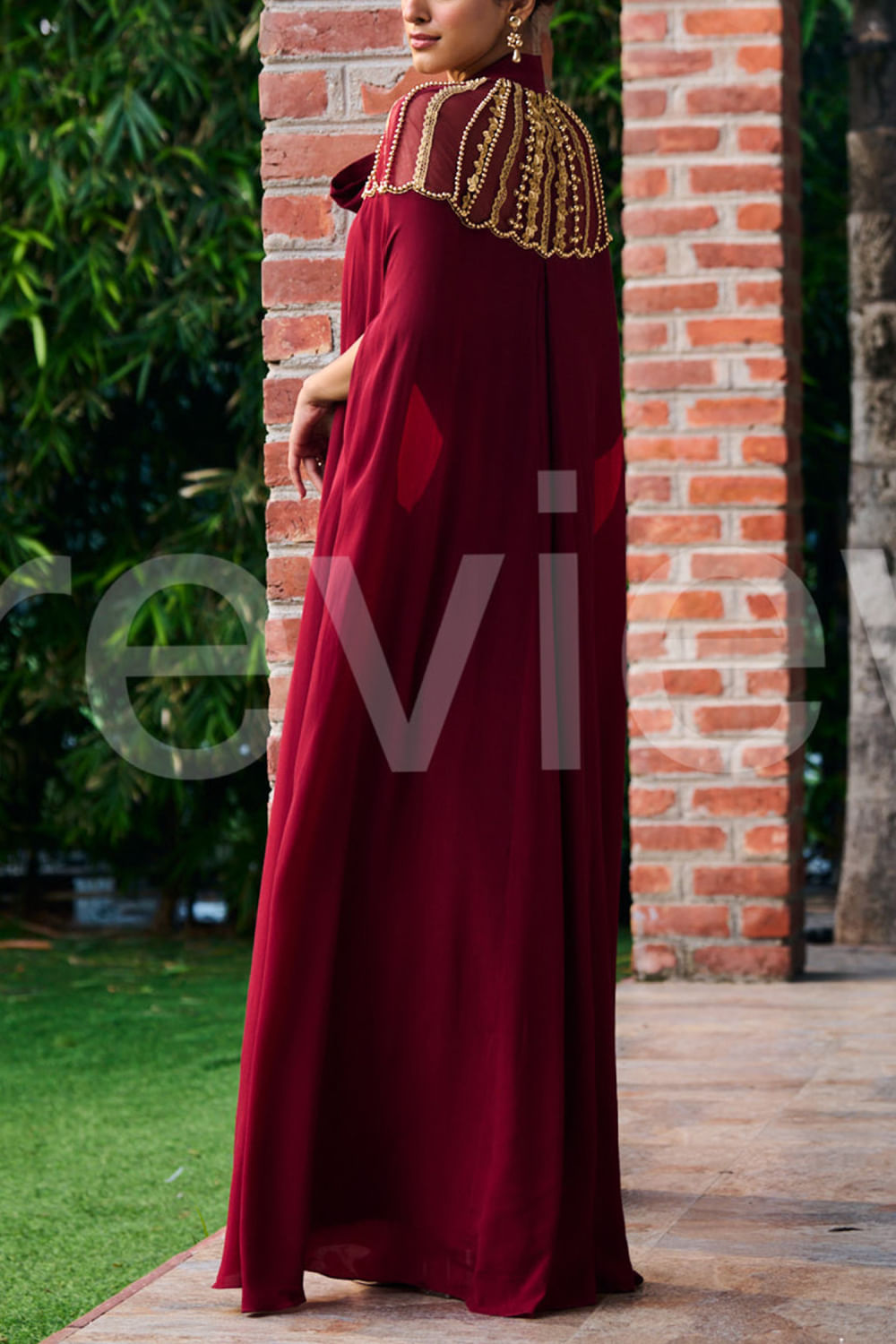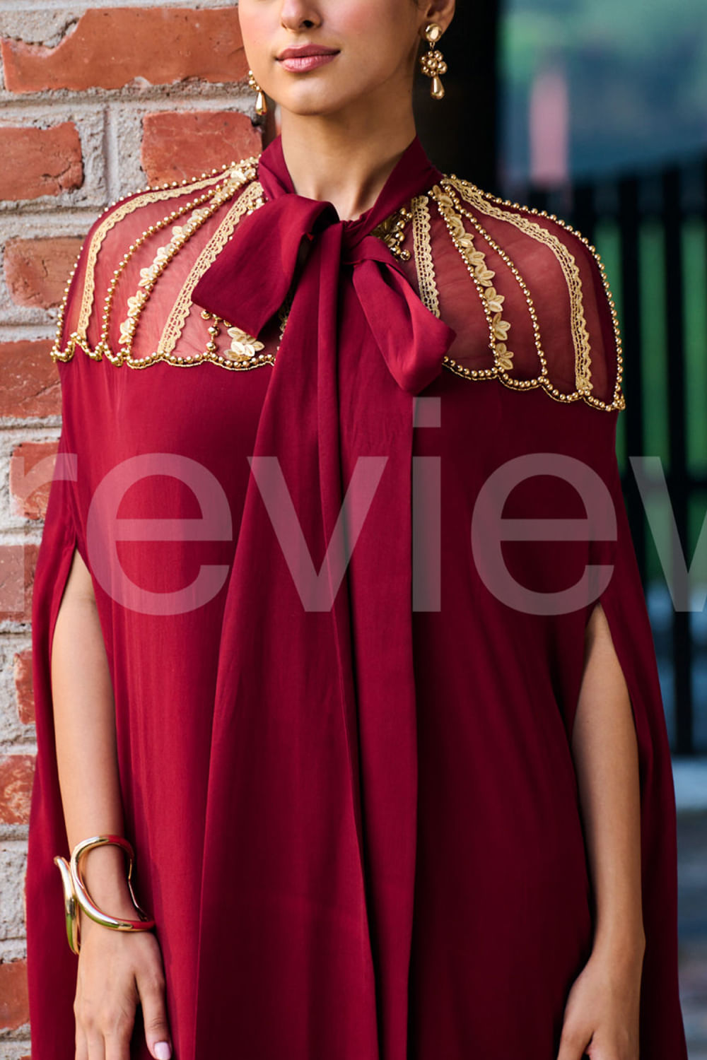 Ohaila Khan designs this statement-making kaftan crafted in crepe with a front bow tie-up detailing featuring bead and sequin hand embroidery. Style the look with a chunky ring and stilettos for a gala night.