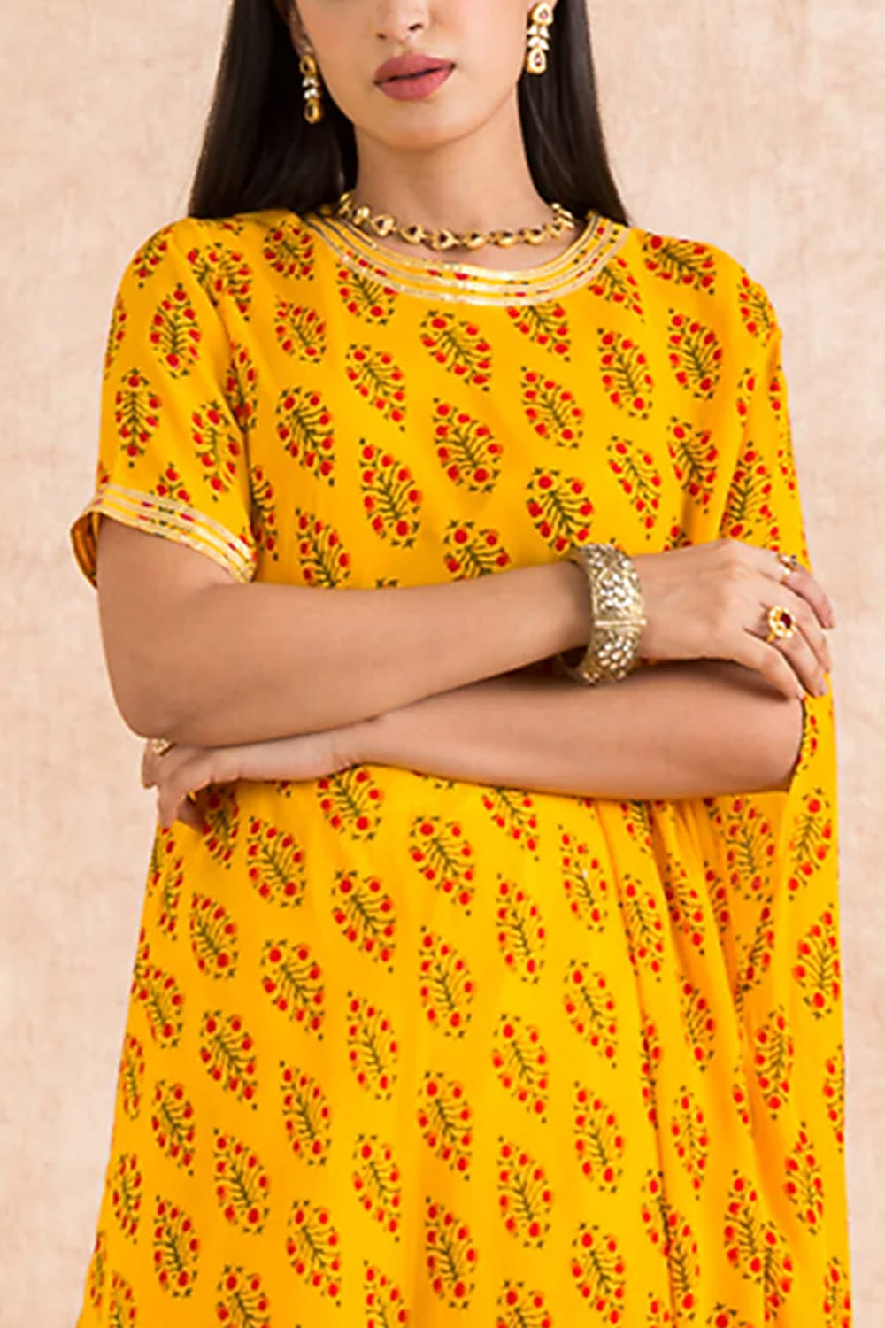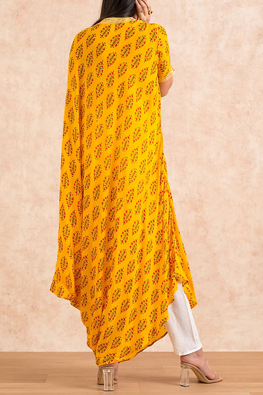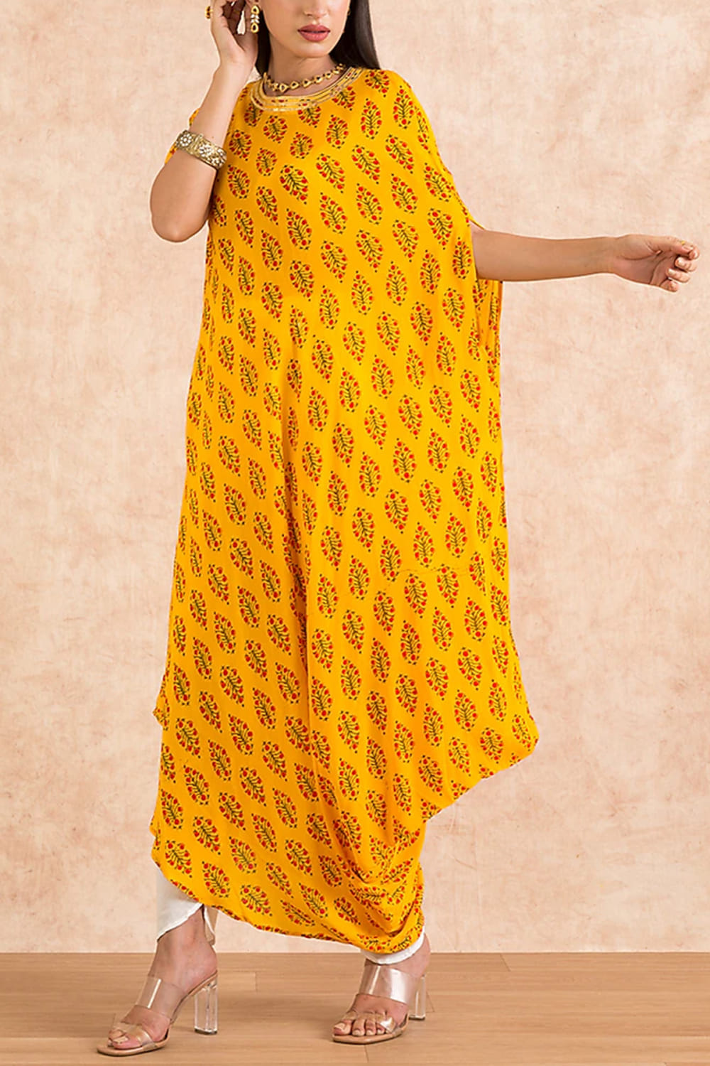 Palak & Mehak designs this bright cowl kurta in georgette enhanced with block prints in leaf patterns featuring gota detailing on the neckline and sleeve, complementing it with a pair of contrast pants. Style the look with chandbaalis and embellished wedges for pre-wedding festivities.