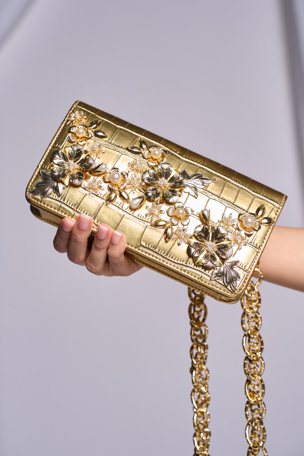 Papa Don't Preach Accessories designs this iconic waist belt bag in faux leather, encrusted with 24k plated embellishments, Swarovski pearls, and glass beads, featuring a chain link belt. Style it with a printed gown to amp up the look.