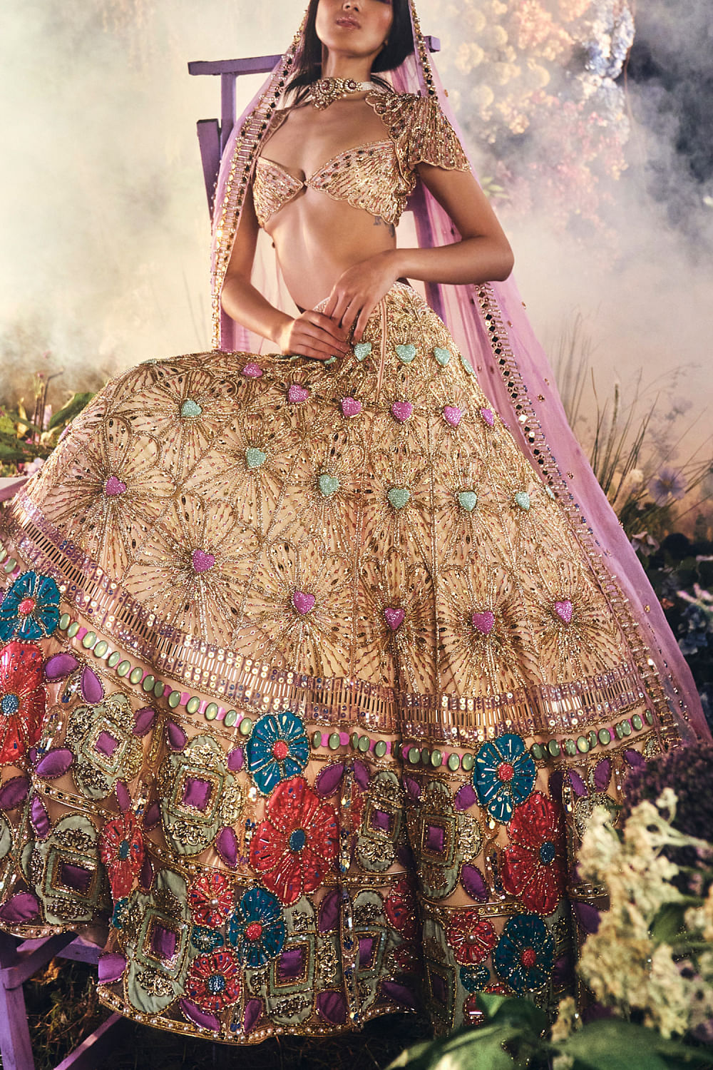 Papa Don't Preach designs this drama-evoking lehenga encapsulated with zari embroidery, 3D embellishments and multicolour applique work featuring sequins and glass cut crystals in heart and floral motifs, pairing it with a matching embroidered blouse and double dupattas. Style the look with a polki embellished choker set and an embellished kada for a wedding ceremony.