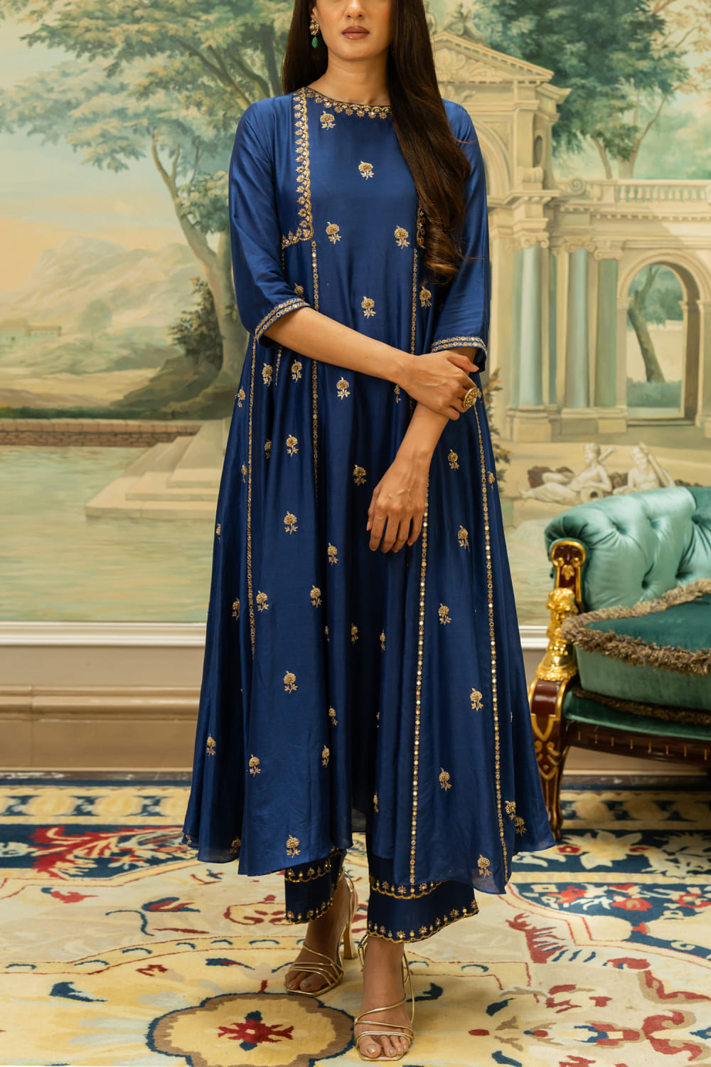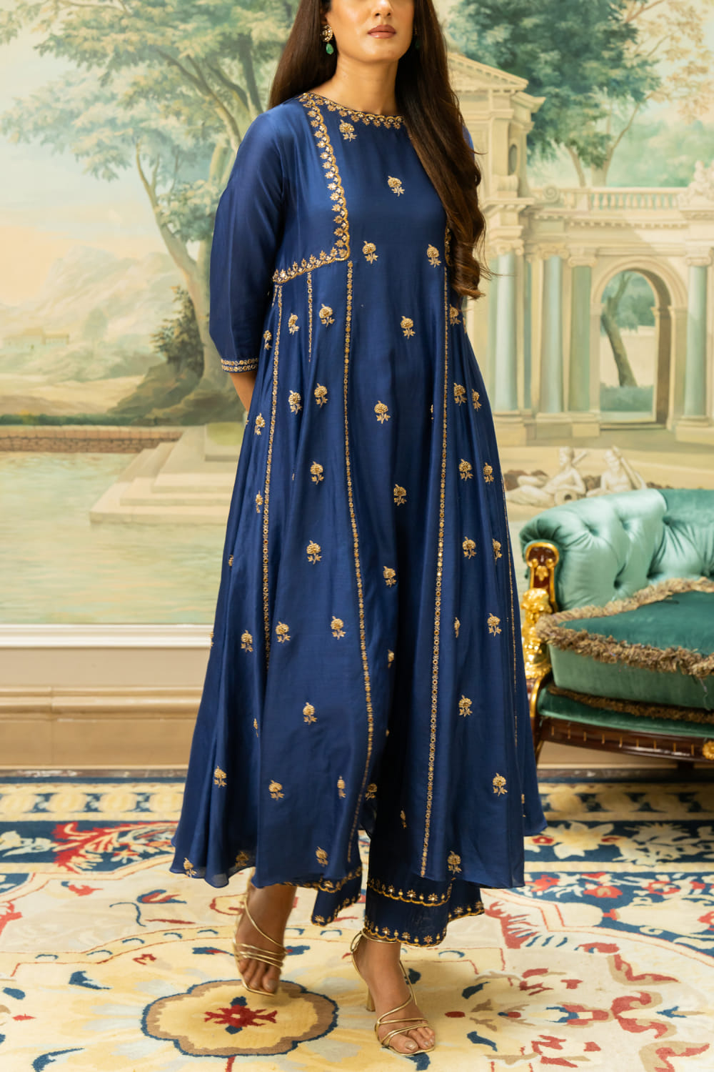 Paulmi & Harsh designs this stunning kurta embraced in chiniya silk with antique gold hand embroidery detailing in floral motifs featuring a flared silhouette, complementing it with matching pants. Style the look with kundan earrings and an embroidered clutch for a striking impression.