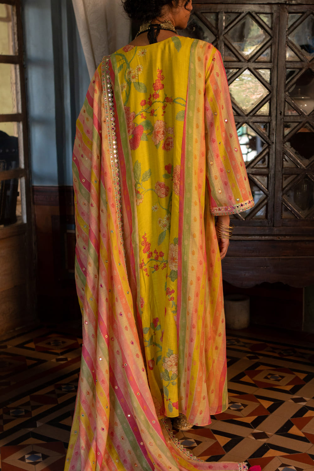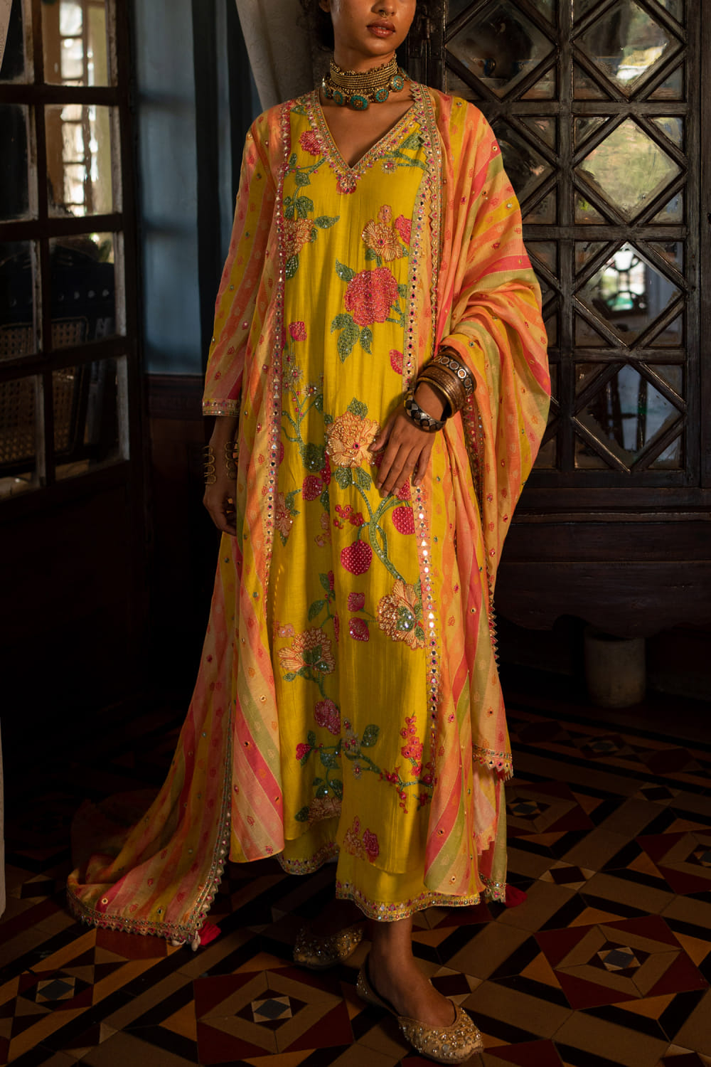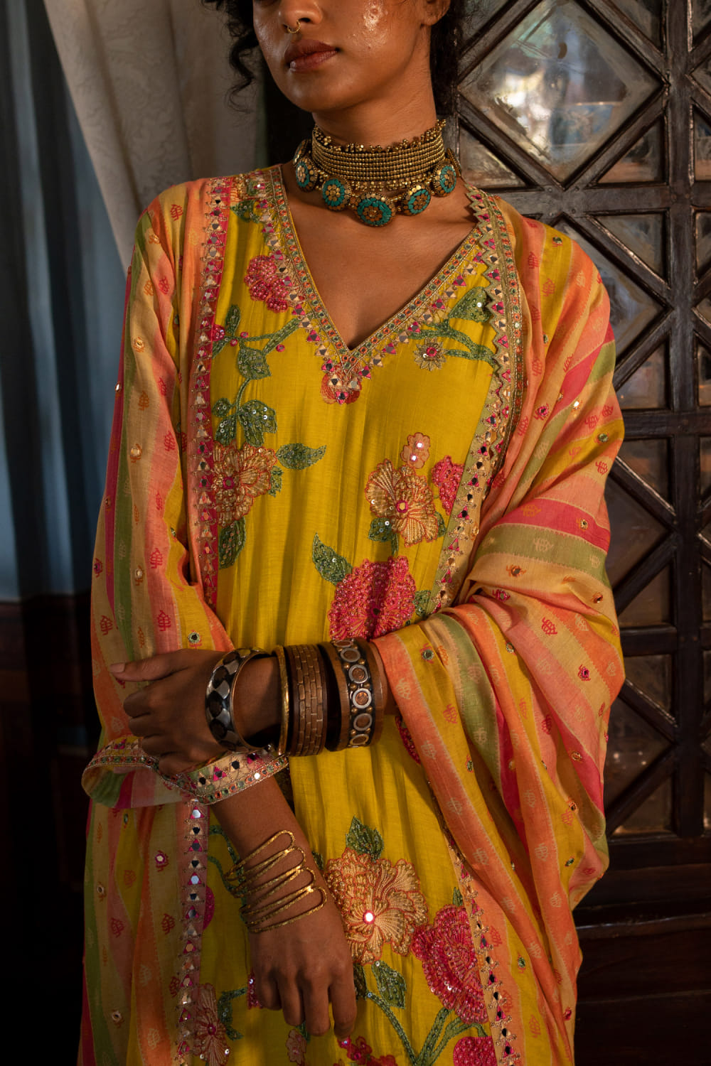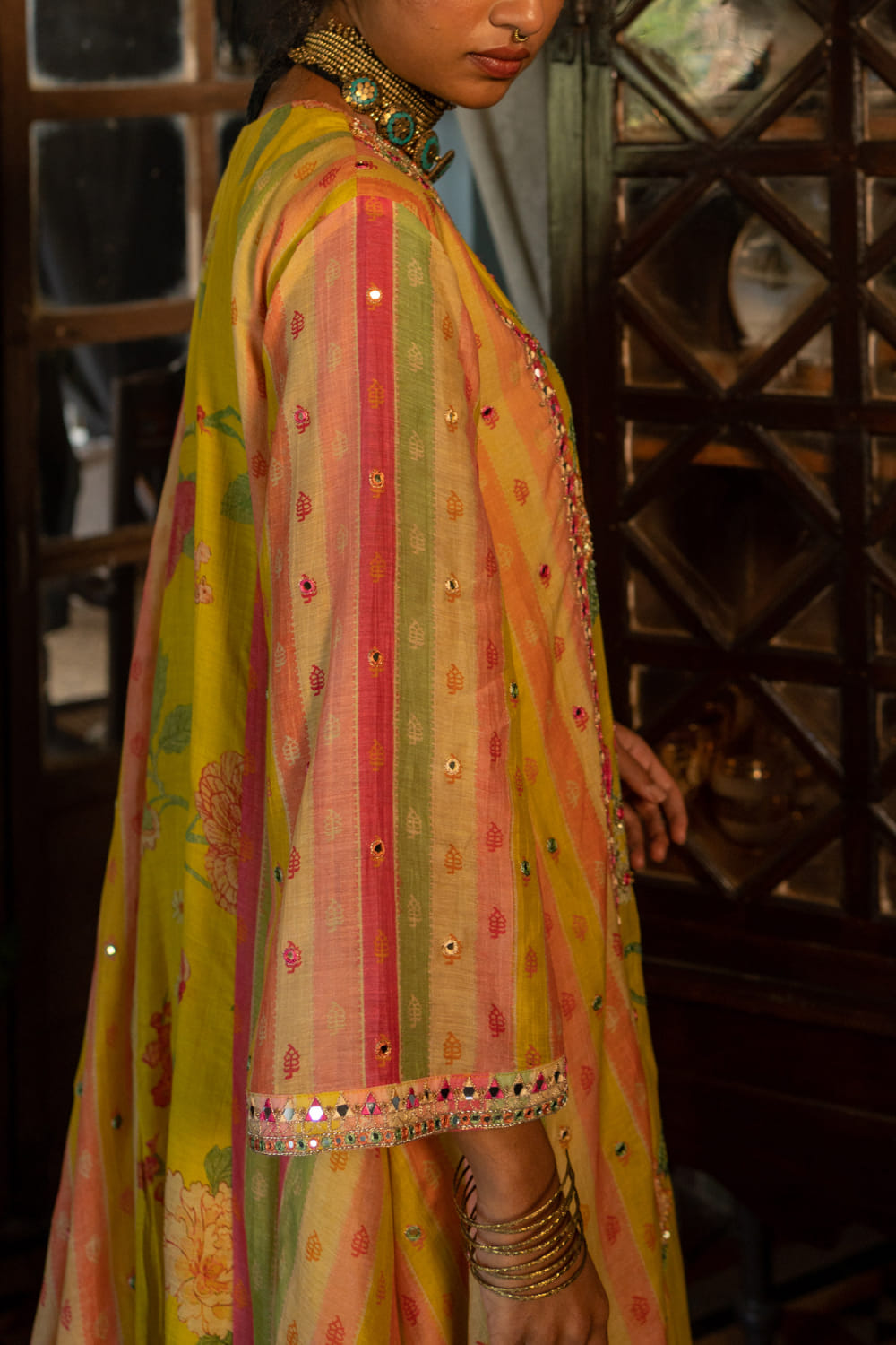 Paulmi & Harsh designs this eye-catching kurta in chanderi encapsulated with floral and stripe prints featuring embroidery detailing and delicate embellishments, complementing it with pants and a matching dupatta. Style the look with a velvet box clutch and embroidered juttis for the haldi ceremony.