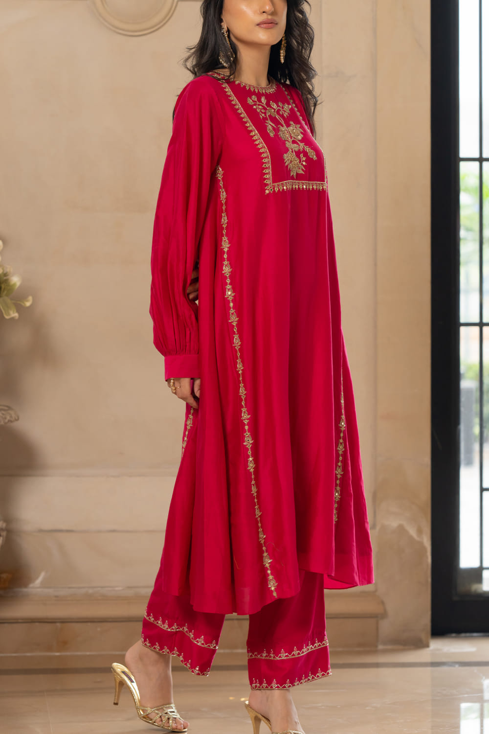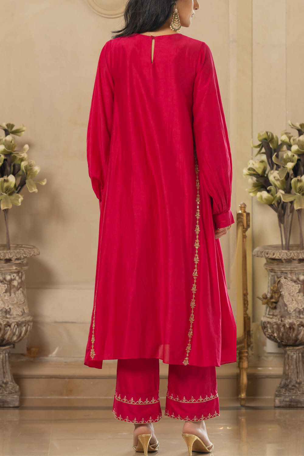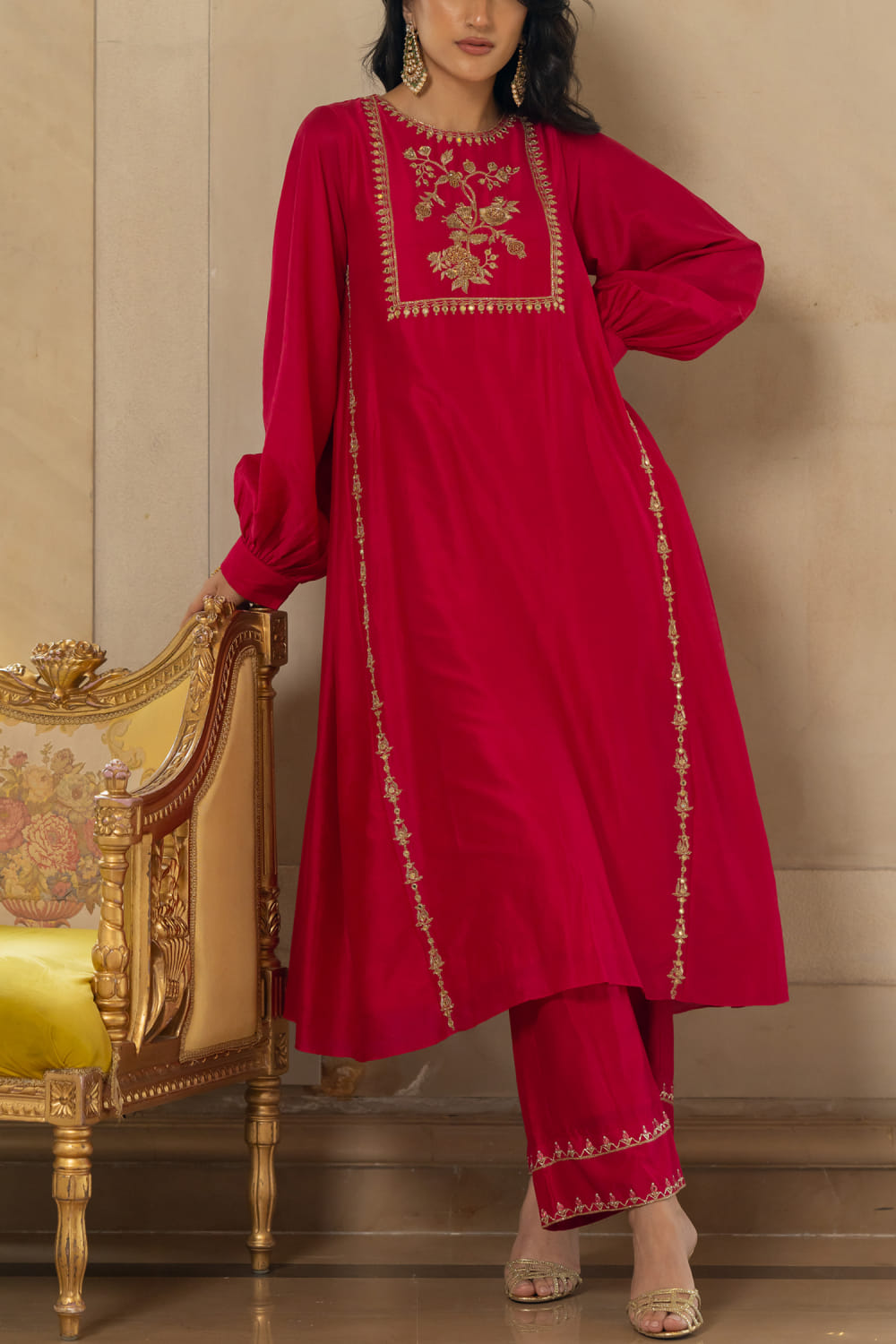 Paulmi & Harsh designs this striking kurta crafted in chiniya silk with antique gold hand embroidery detailing in floral and pomegranate patterns on the yoke featuring a flared silhouette, teaming it with matching pants. Style the look with chandbalis and juttis for pre-wedding festivities.