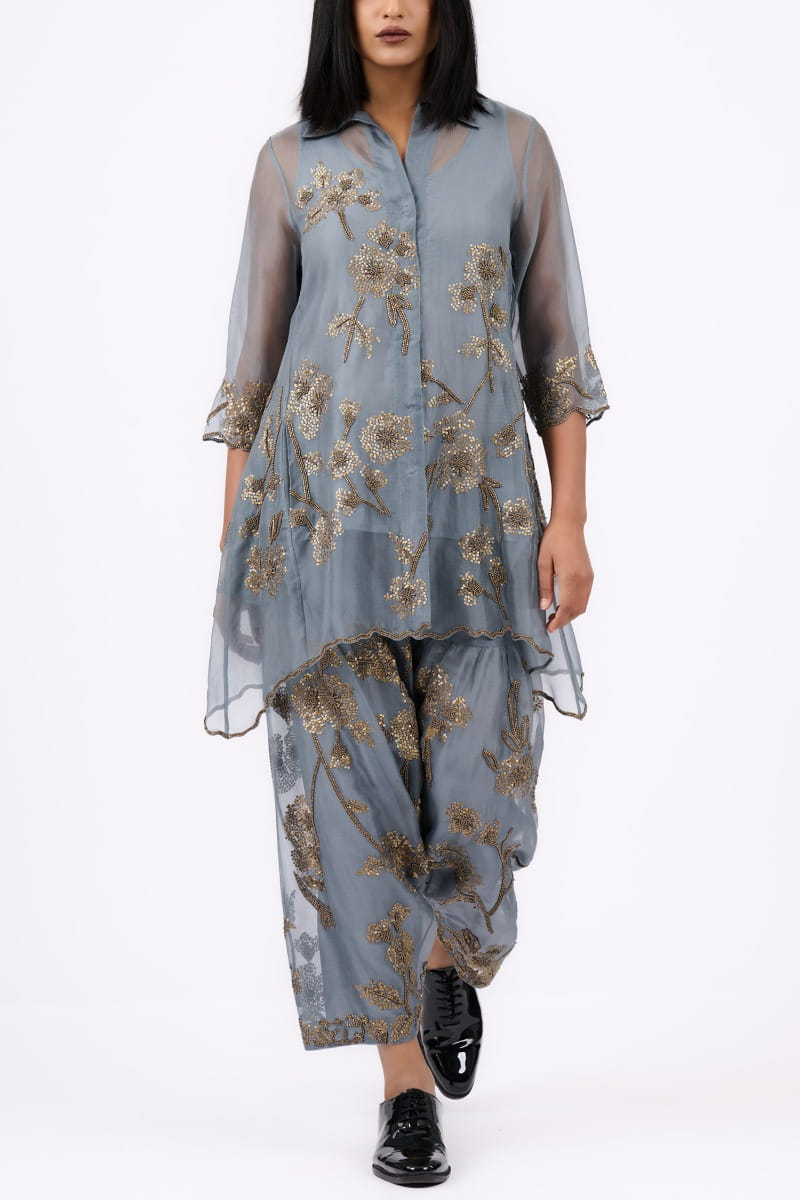 Peachoo designs this cascading jacket in organza, adorned with bead and sequin work, featuring an embellished hem and paired with a satin slip. Style it with gold danglers for a festive affair. The salwar shown here is for styling purposes only.