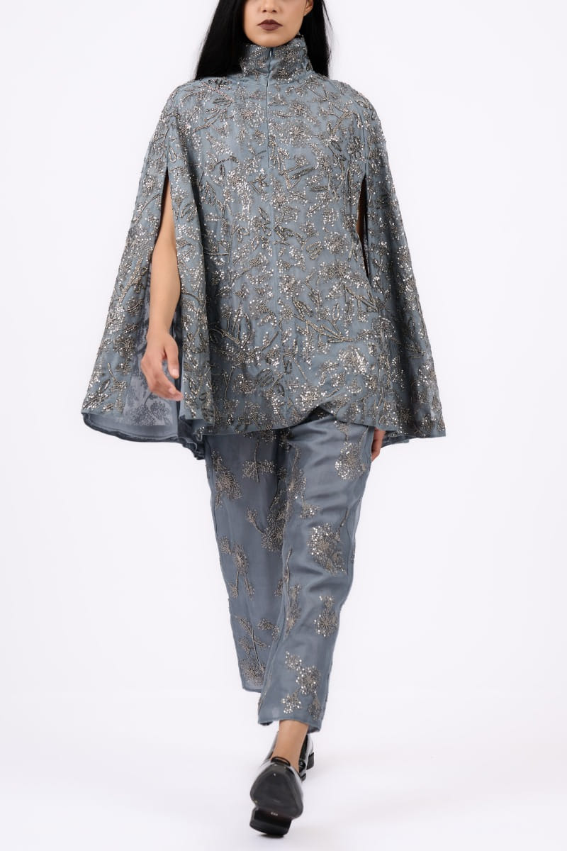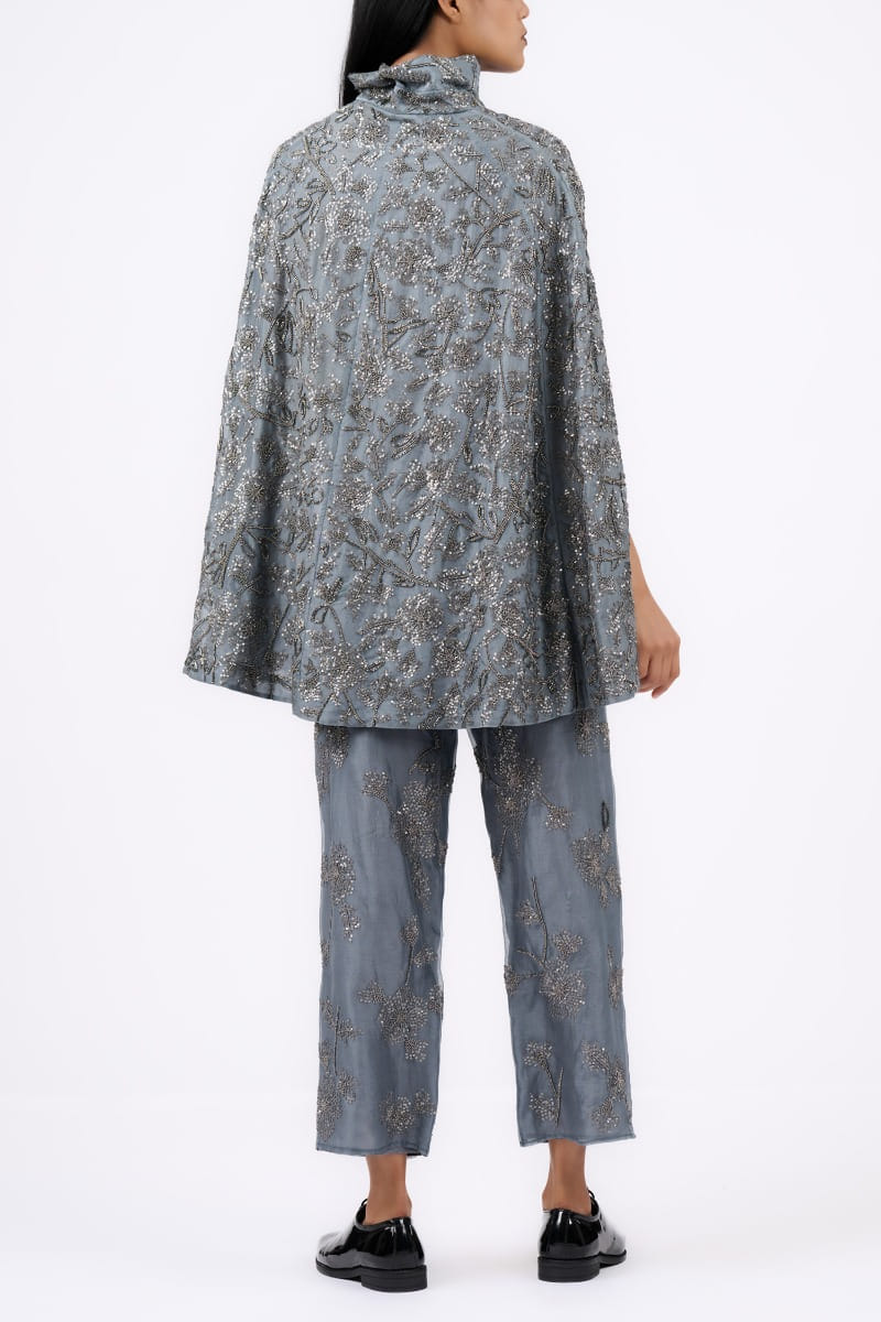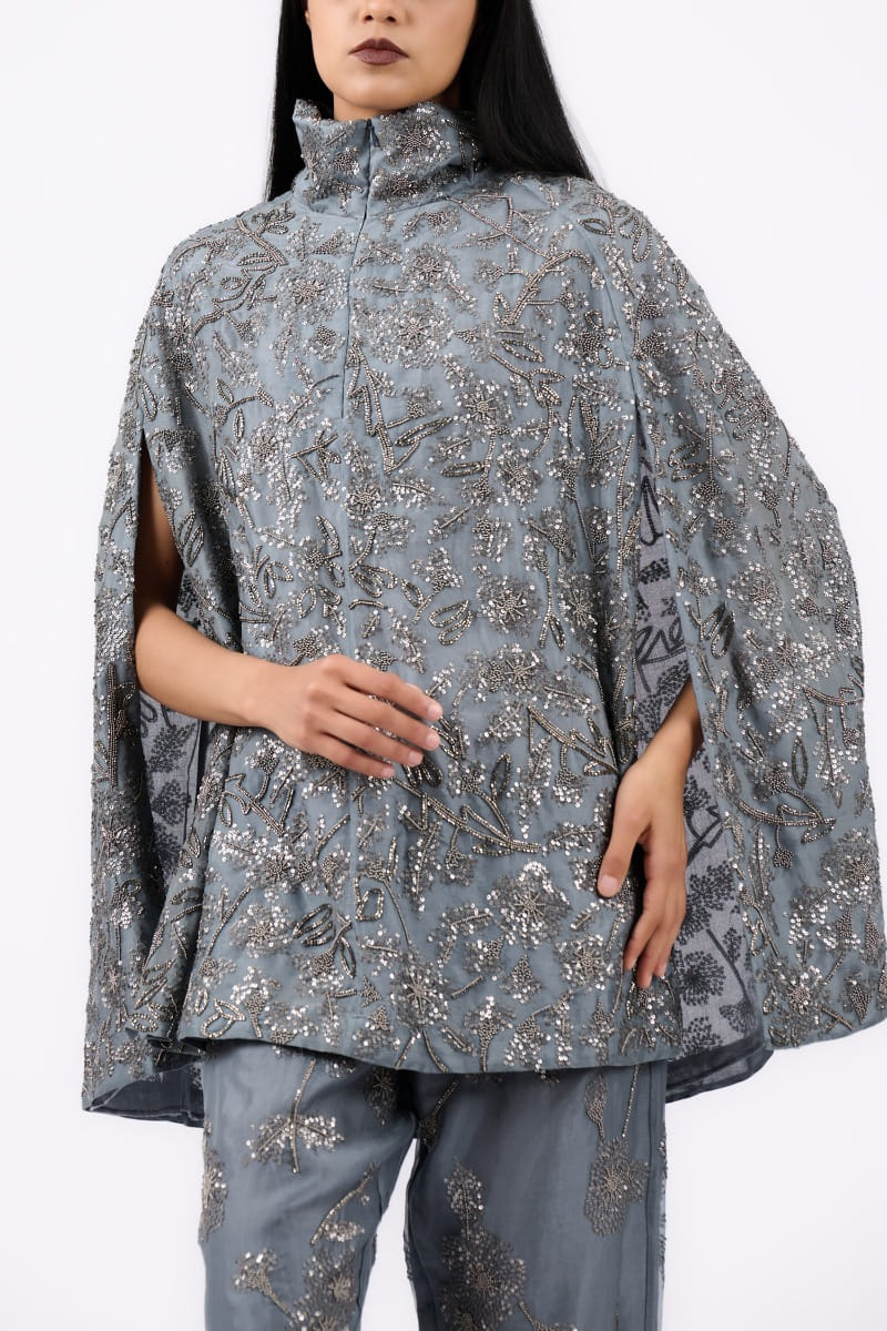 Peachoo designs this in-vogue cape in organza adorned with bead and sequin embroidery featuring a high neck design. Style it with an embellished bracelet. The pants here are shown for styling purposes only.