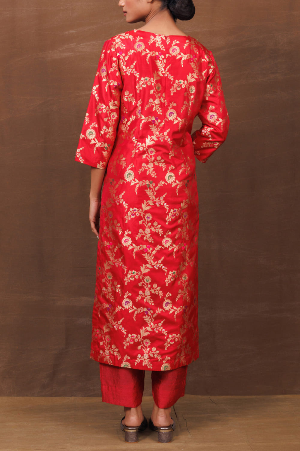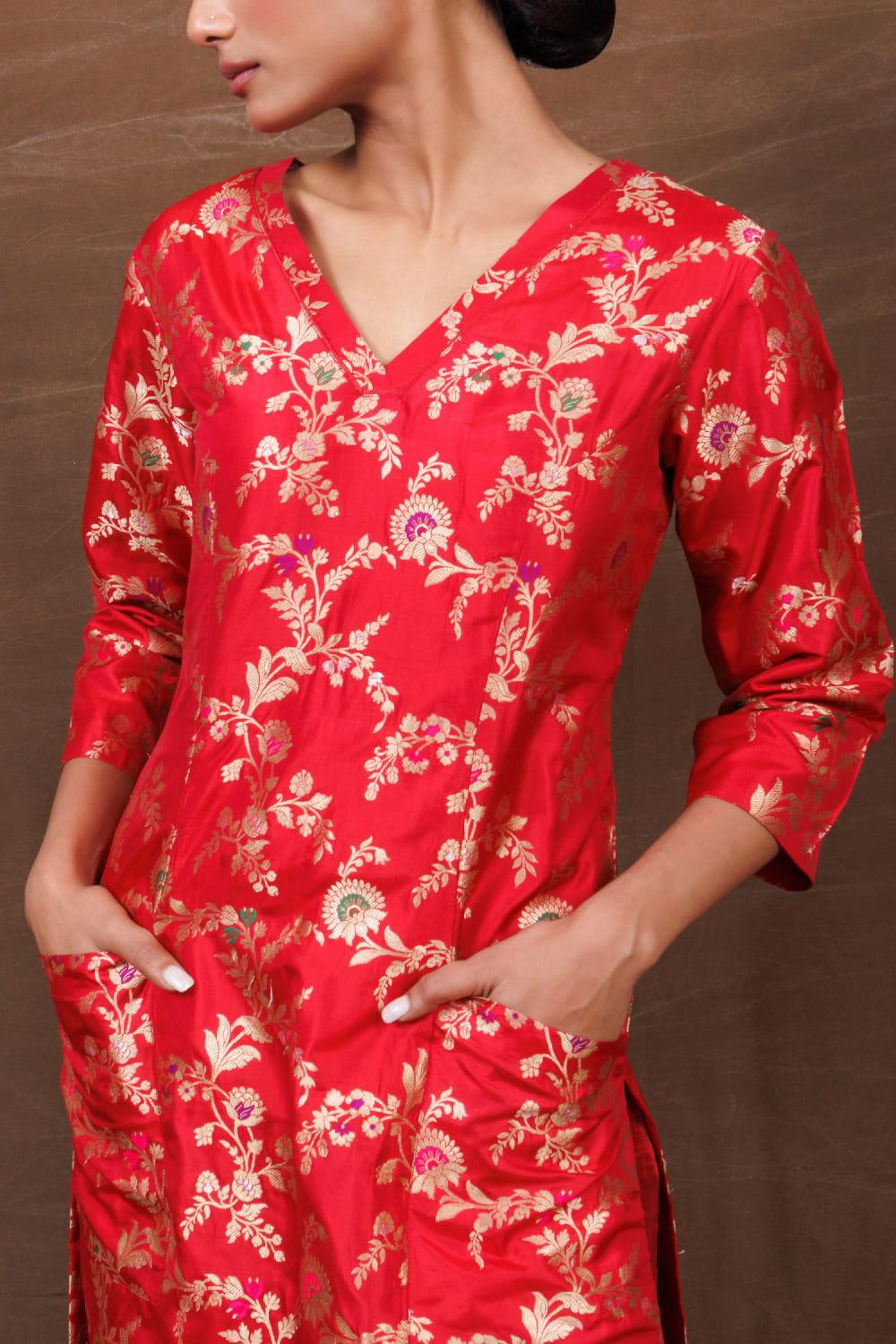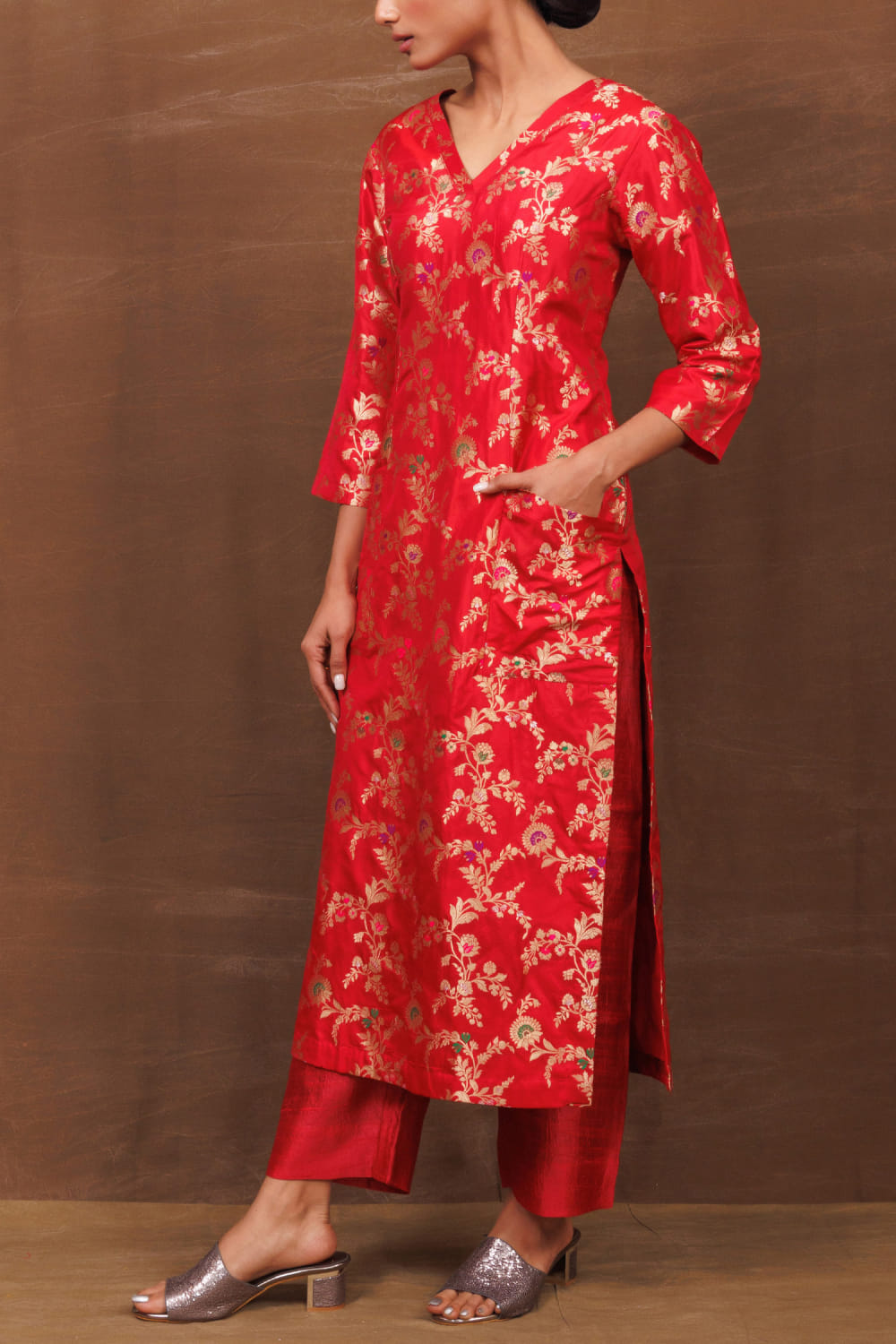Red handwoven banarasi pocket kurta set