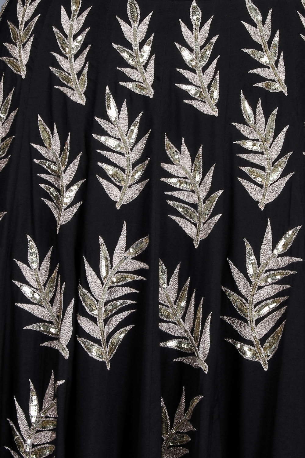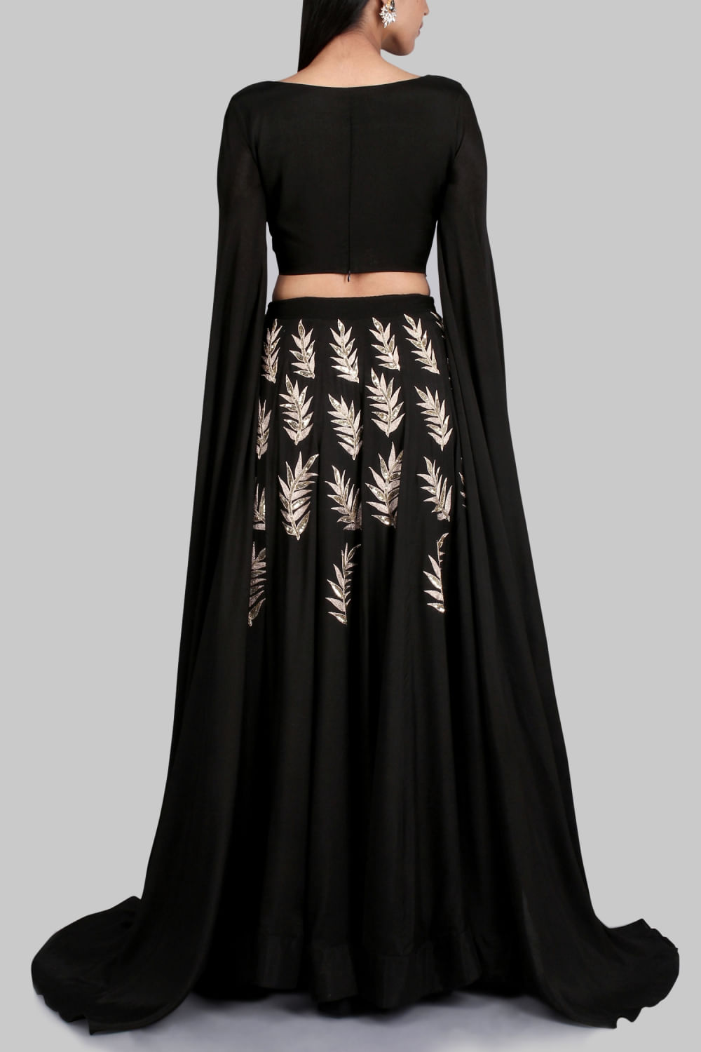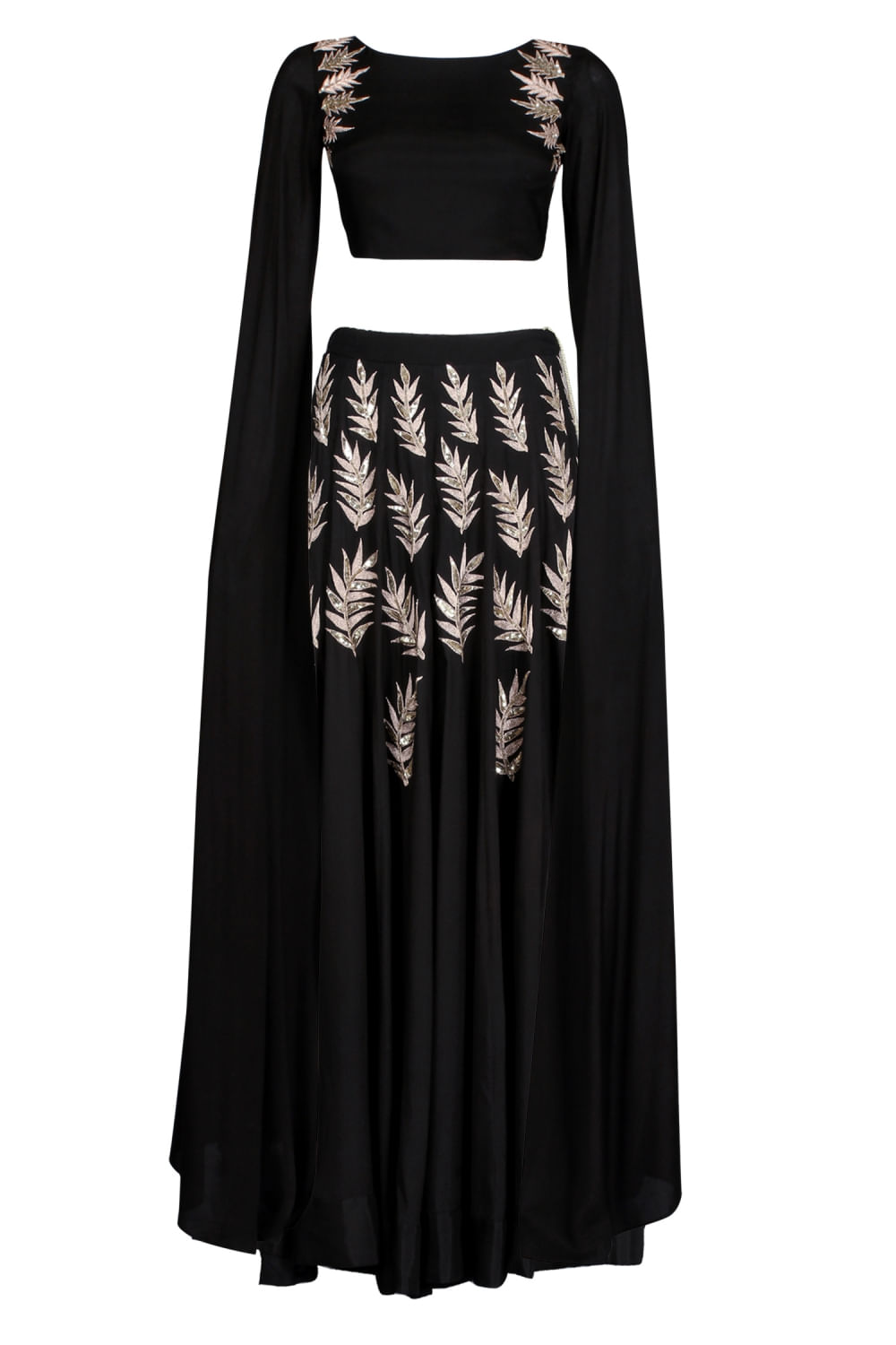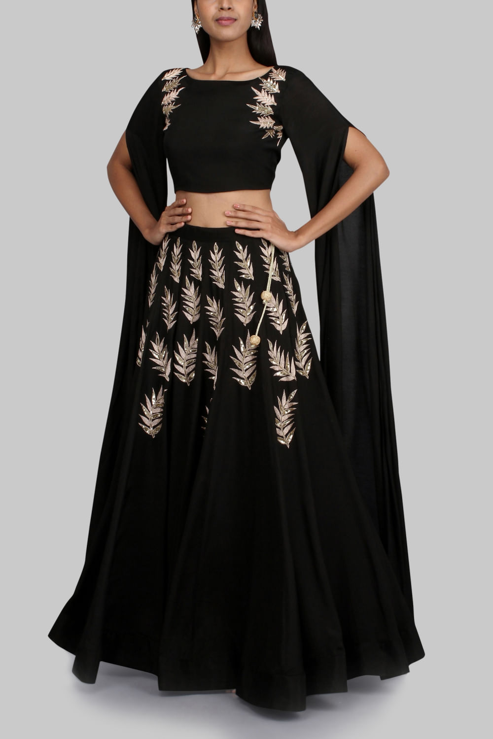 Pratyusha Garimella will have you looking like a midnight beauty in this black fern leaf motif lehenga with caped crop-top. Style it with complementing gold jewellery.
