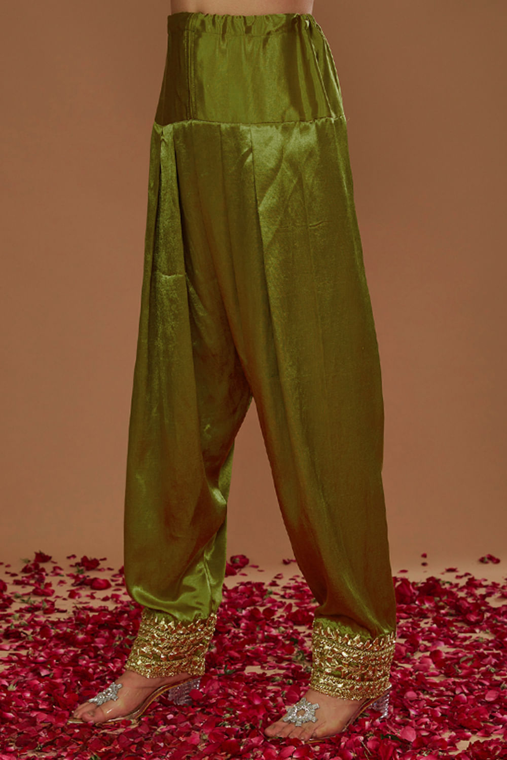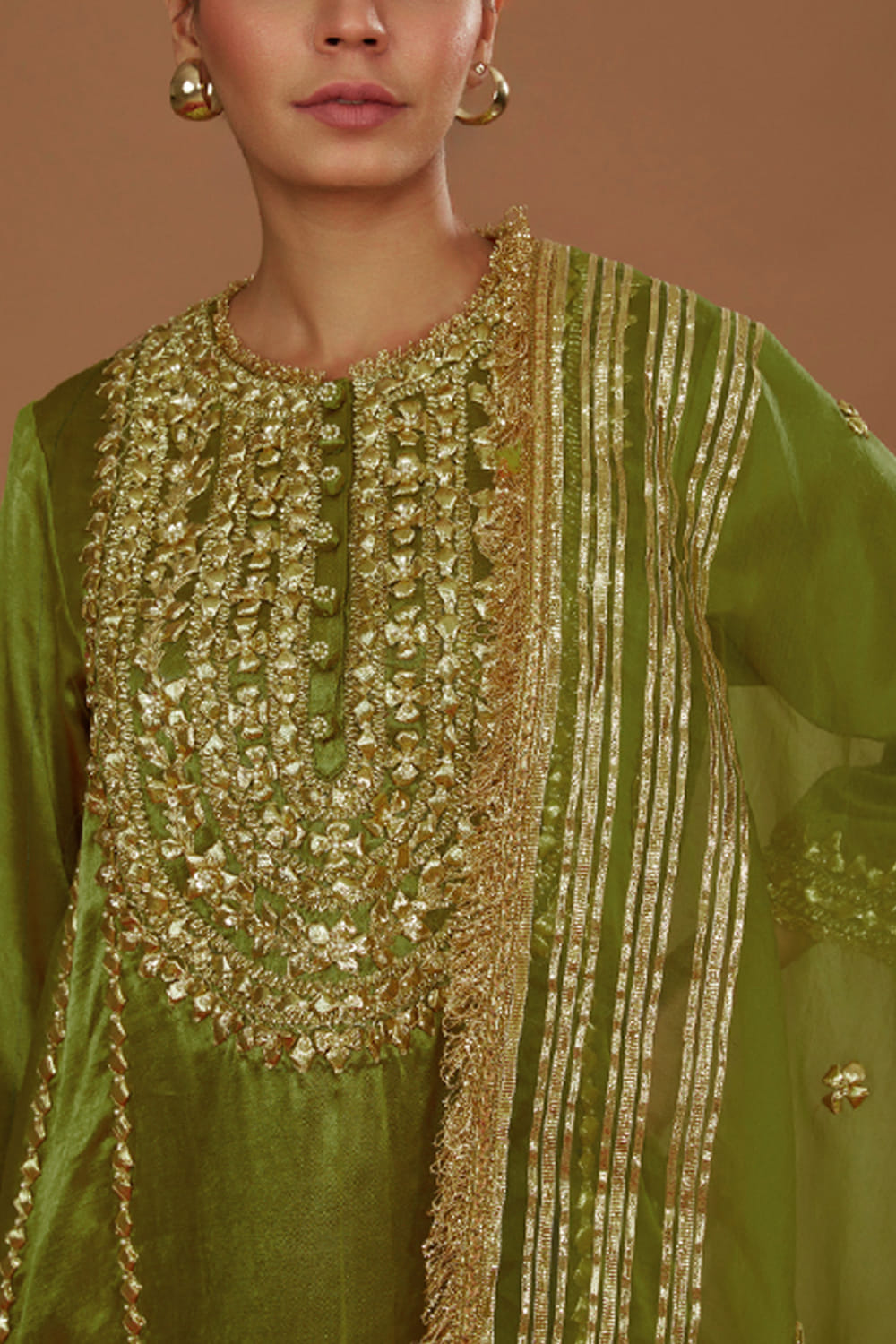 Preeti S Kapoor designs this vivid kurta embraced in mashru silk hand-embroidered with intricate gota work, delicate pearls and sequin embellishments in floral patterns, teaming it with a matching salwar and a matching dupatta. Style the look with polki earrings and juttis for a festive vibe.