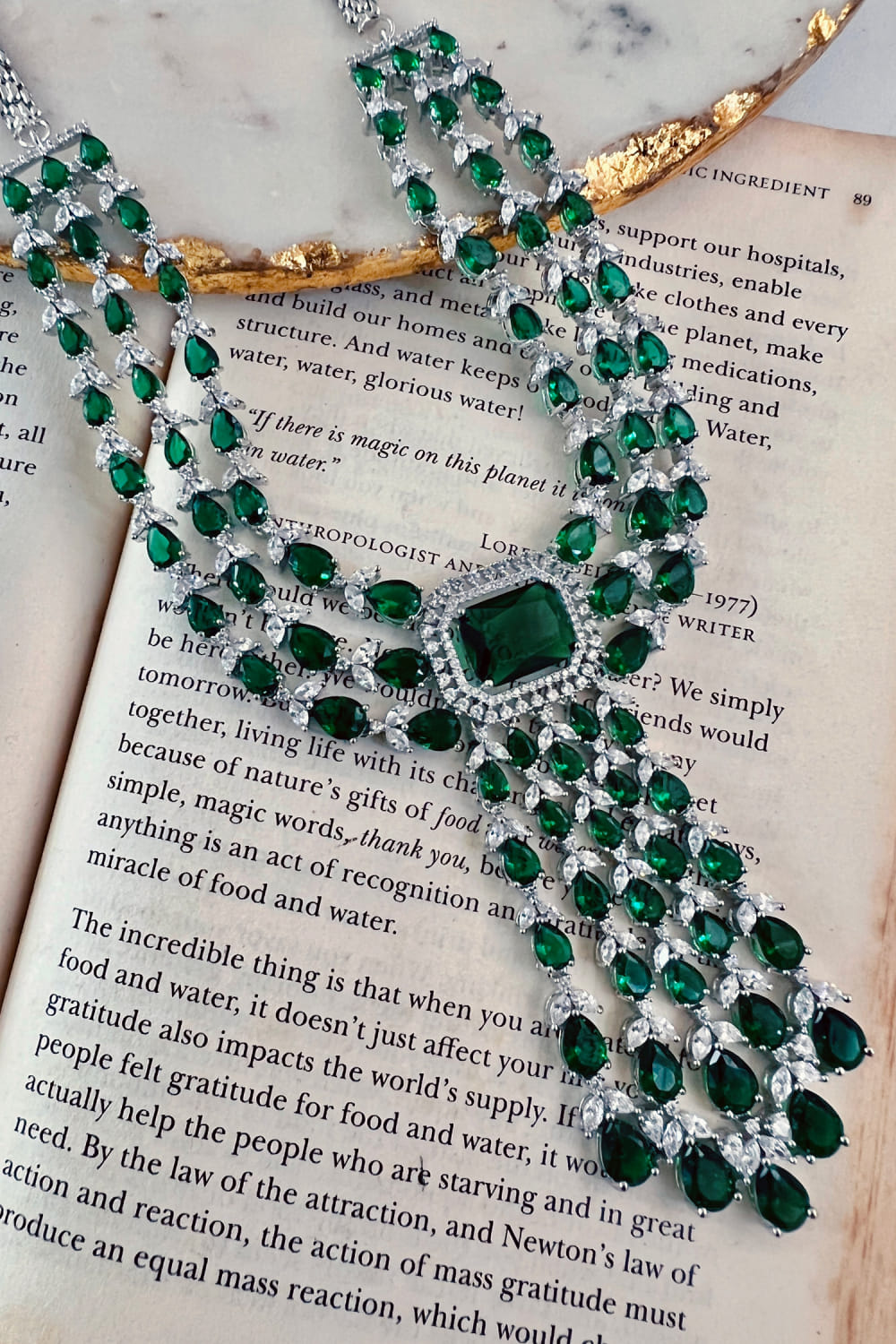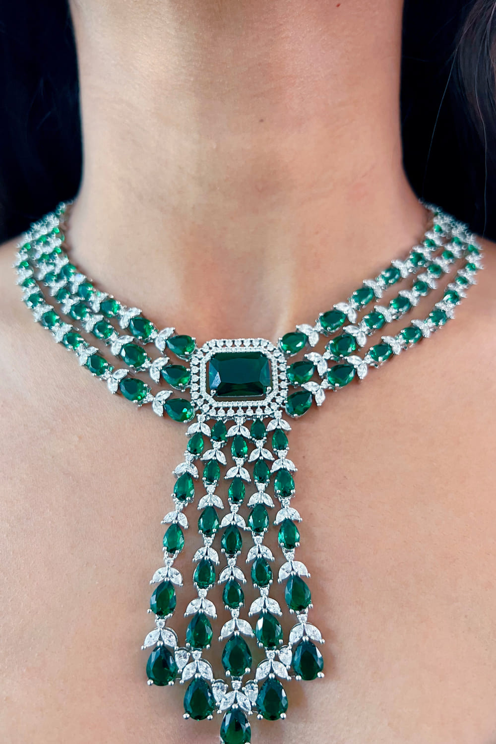 Prerto designs this glamorous choker customised in rhodium-plated brass enhanced with green emerald and glittering diamond detailing. Style it with a conceptual saree ensemble for a stunning look.