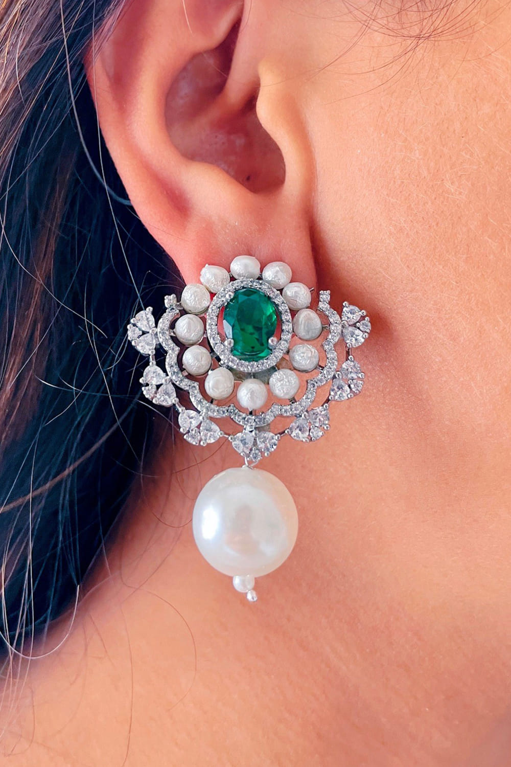 Prerto designs this scintillating pair of drop earrings customised in rhodium-plated brass with emerald-coloured stone, glossy pearls and dainty embellishments. Adorn them with an off-shoulder dress for a dinner soiree.