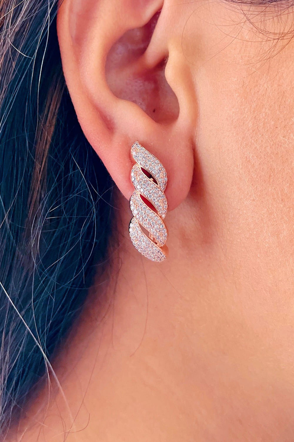 Prerto designs this splendid pair of danglers customised in brass with dainty crystal embellishments in twisted shapes featuring a rose gold finish. Complement them with a concept sari set for a modern appeal.
