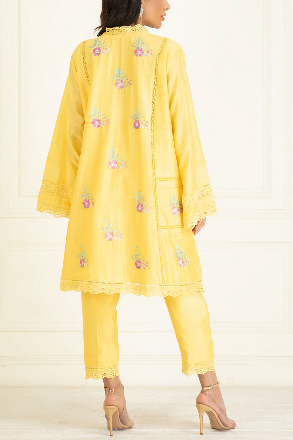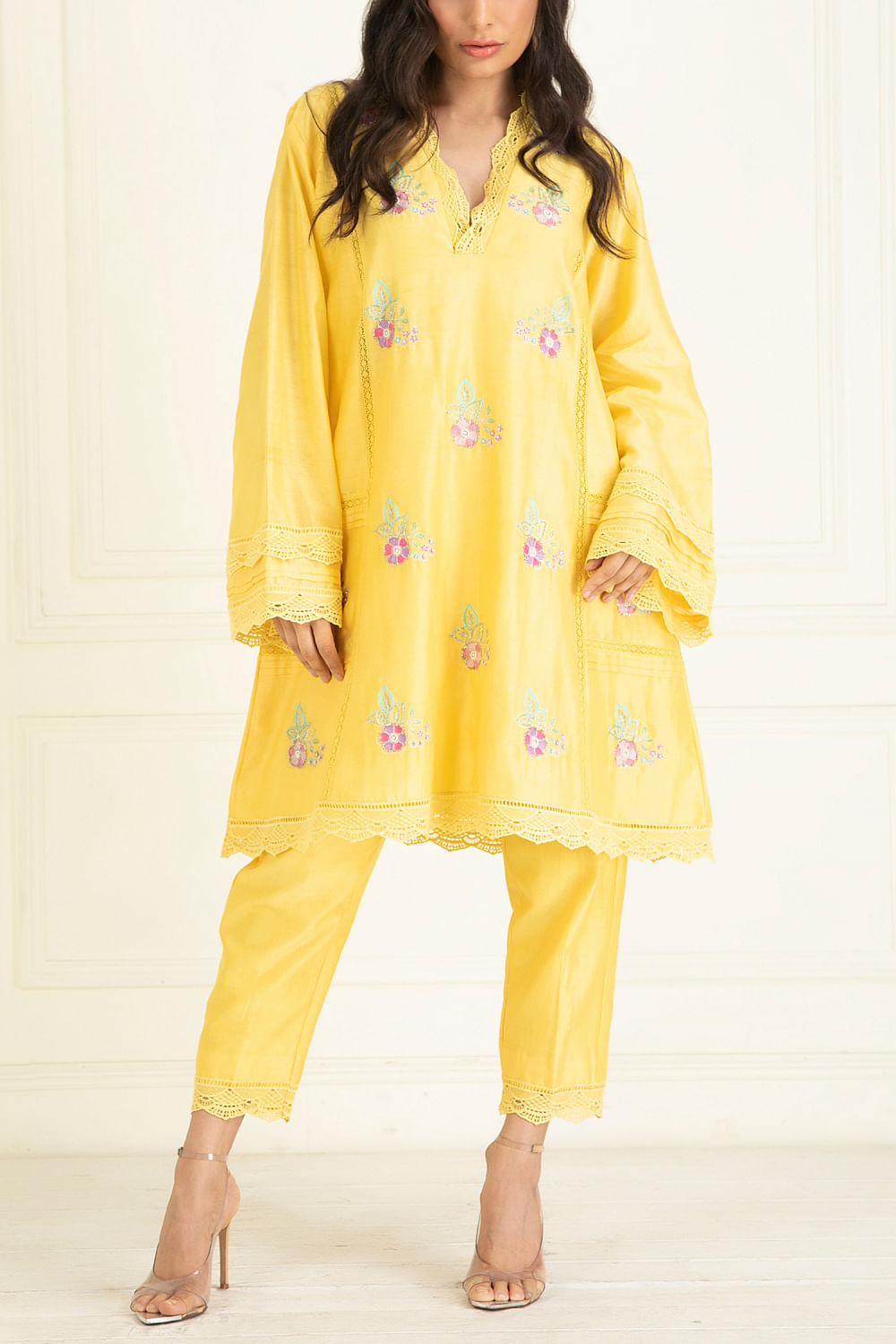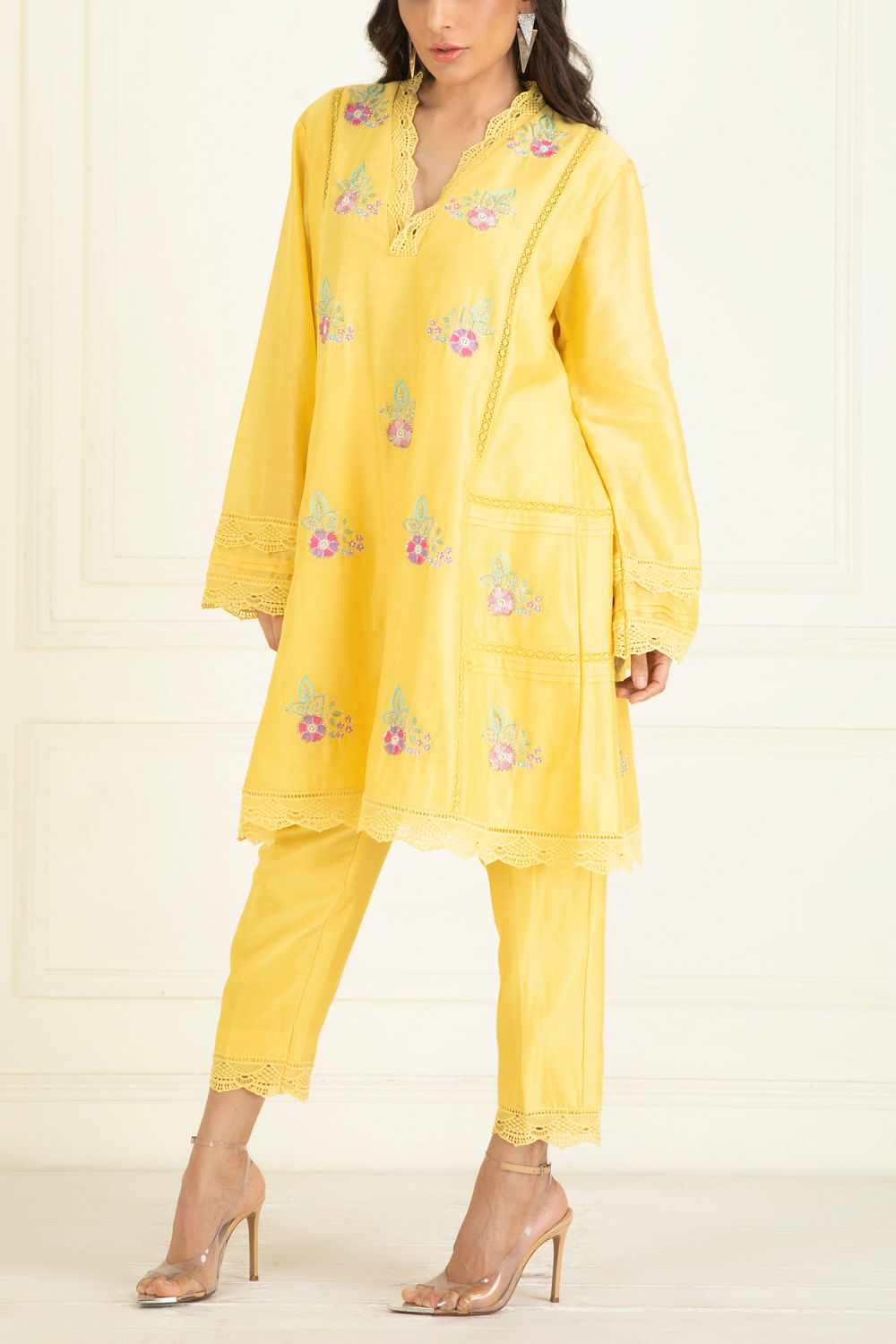 Priyanka Jain designs this festive-ready kurta in chanderi encapsulated with a V-neck, lace detailing, sequins, beads and aari hand embroidery in floral motifs, paired with matching pants. Style the look with embellished jhumkas and juttis.