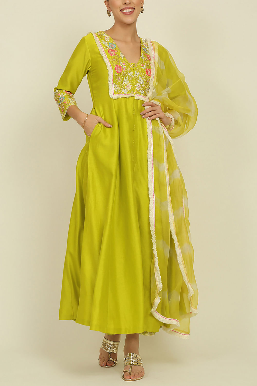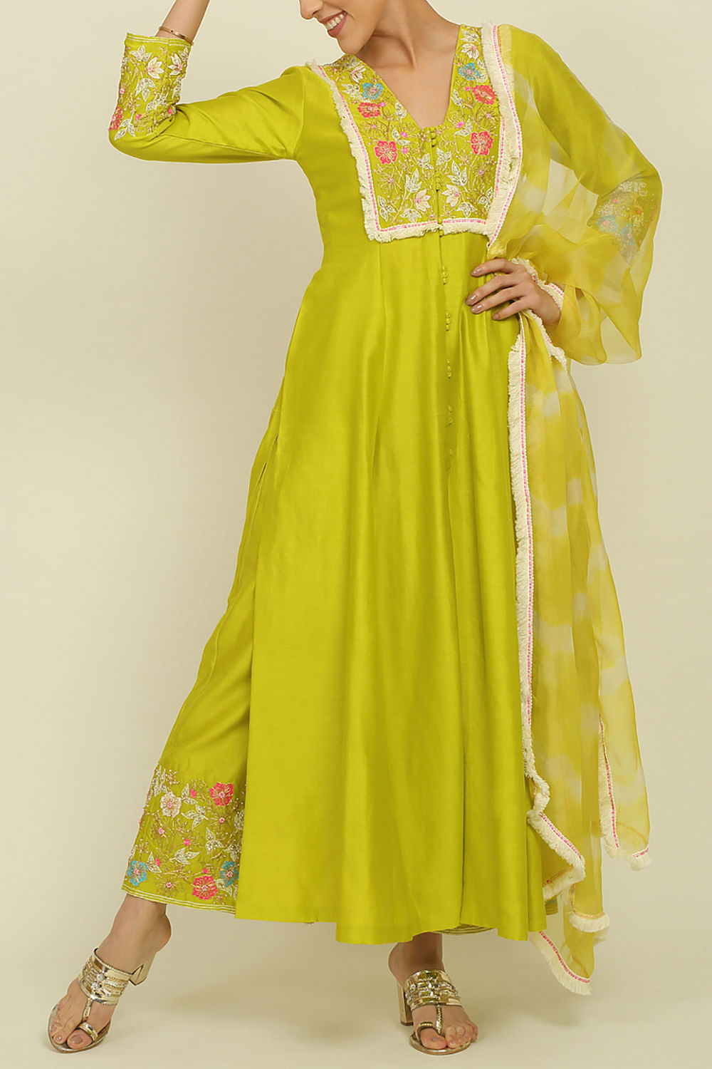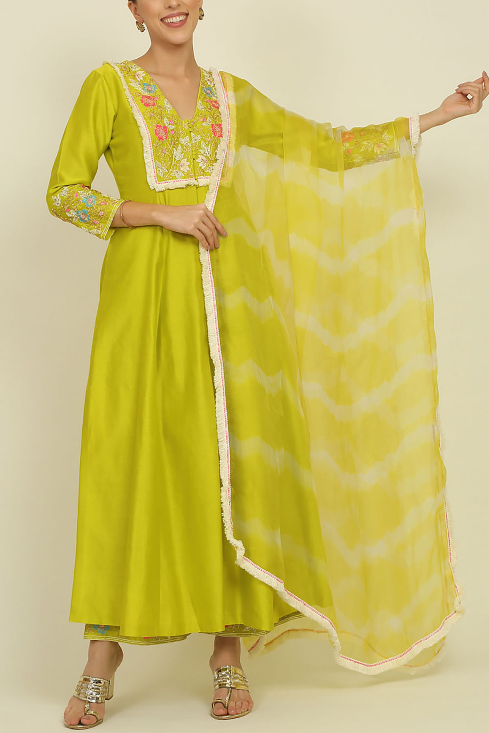 Priyanka Jain designs this striking front open-style kurta in chanderi encapsulated with fringed detailing, patchwork, sequins, beads and dori embroidery in floral patterns, teaming it with matching embroidered palazzo and matching tie-dye dupatta. Style the look with kemp stone earrings and an embellished ring for a festive affair.