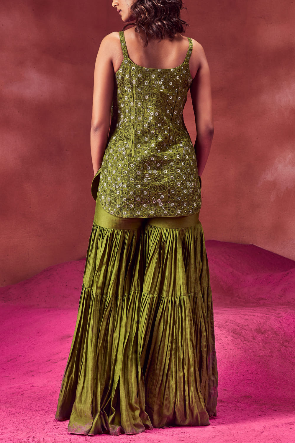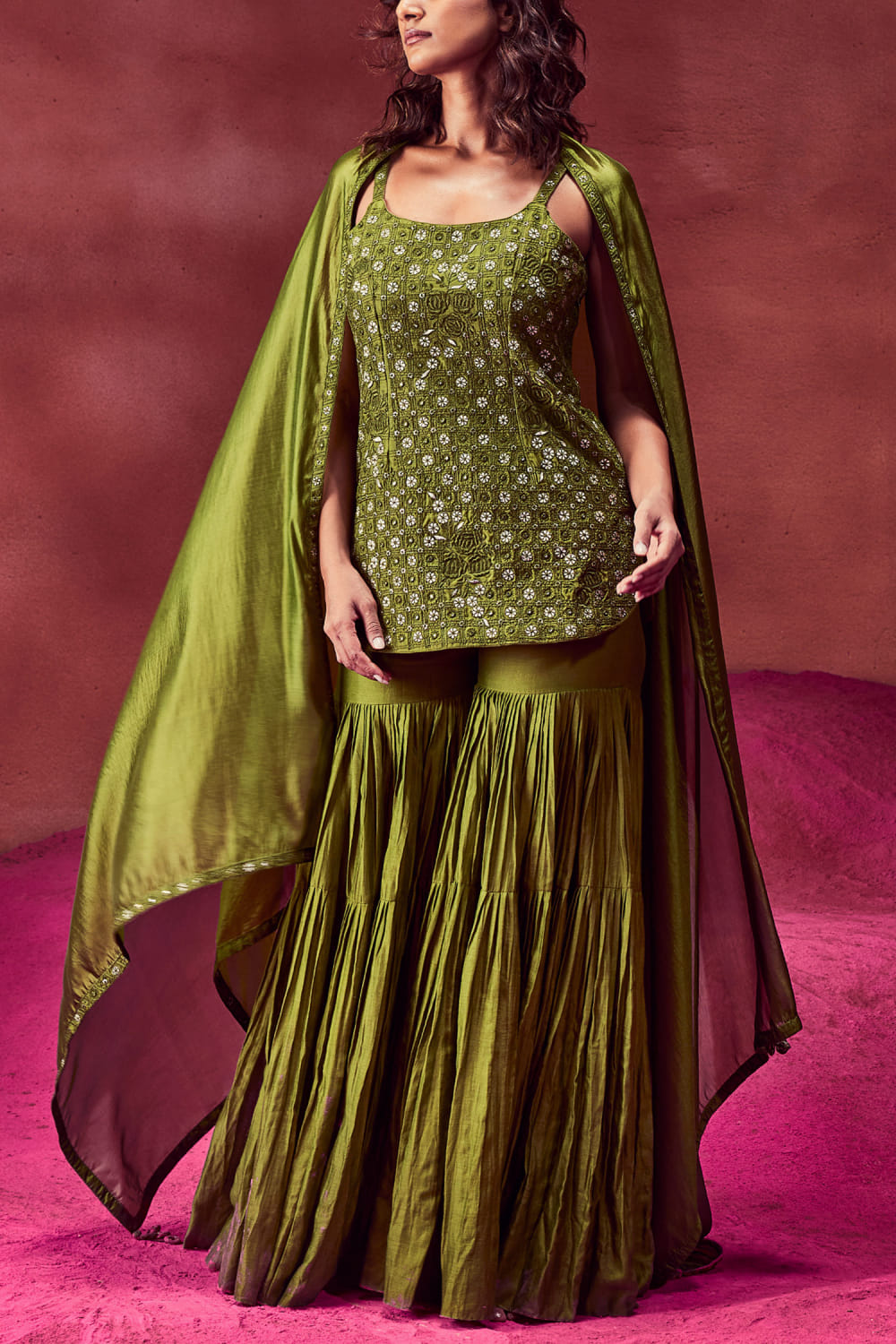 Punit Balana designs this trend-setting gharara with a voluminous flare, teaming it with a sleeveless kurti featuring leather resham work and an organza silk dupatta. Style the look with a polki and pearls necklace set and a potli bag.