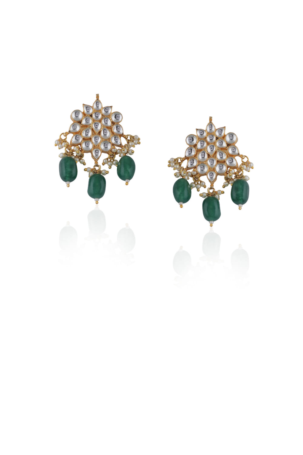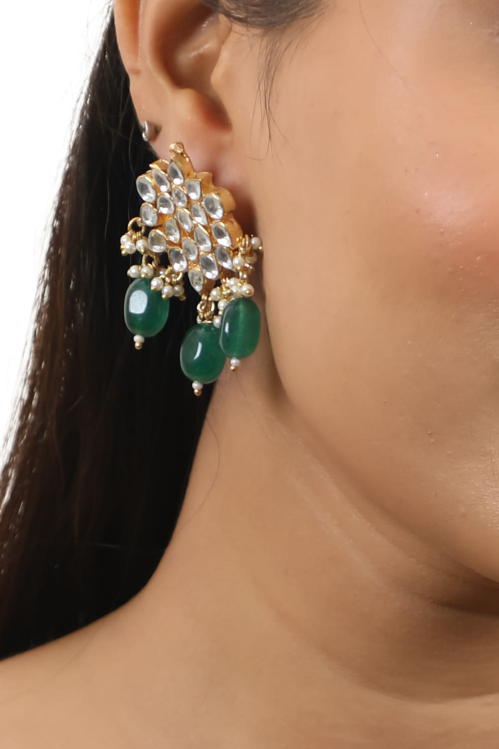 Riana Jewellery designs this exquisite pair of earrings crafted in silver and copper mix metal with a 22kt matt gold finish accentuated with jadtar stones, dainty pearls and semi-precious stones. Style them with a traditional outfit.