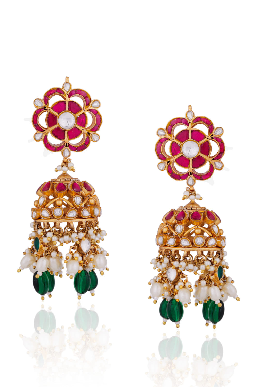 Riana Jewellery designs this enigmatic pair of jhumkas crafted in 22kt gold-plated silver and copper mix metal adorned with delicate pearls, semi-precious stones, bead drops and jadtar embellishments. Style them with a banarasi sari for a regal look.
