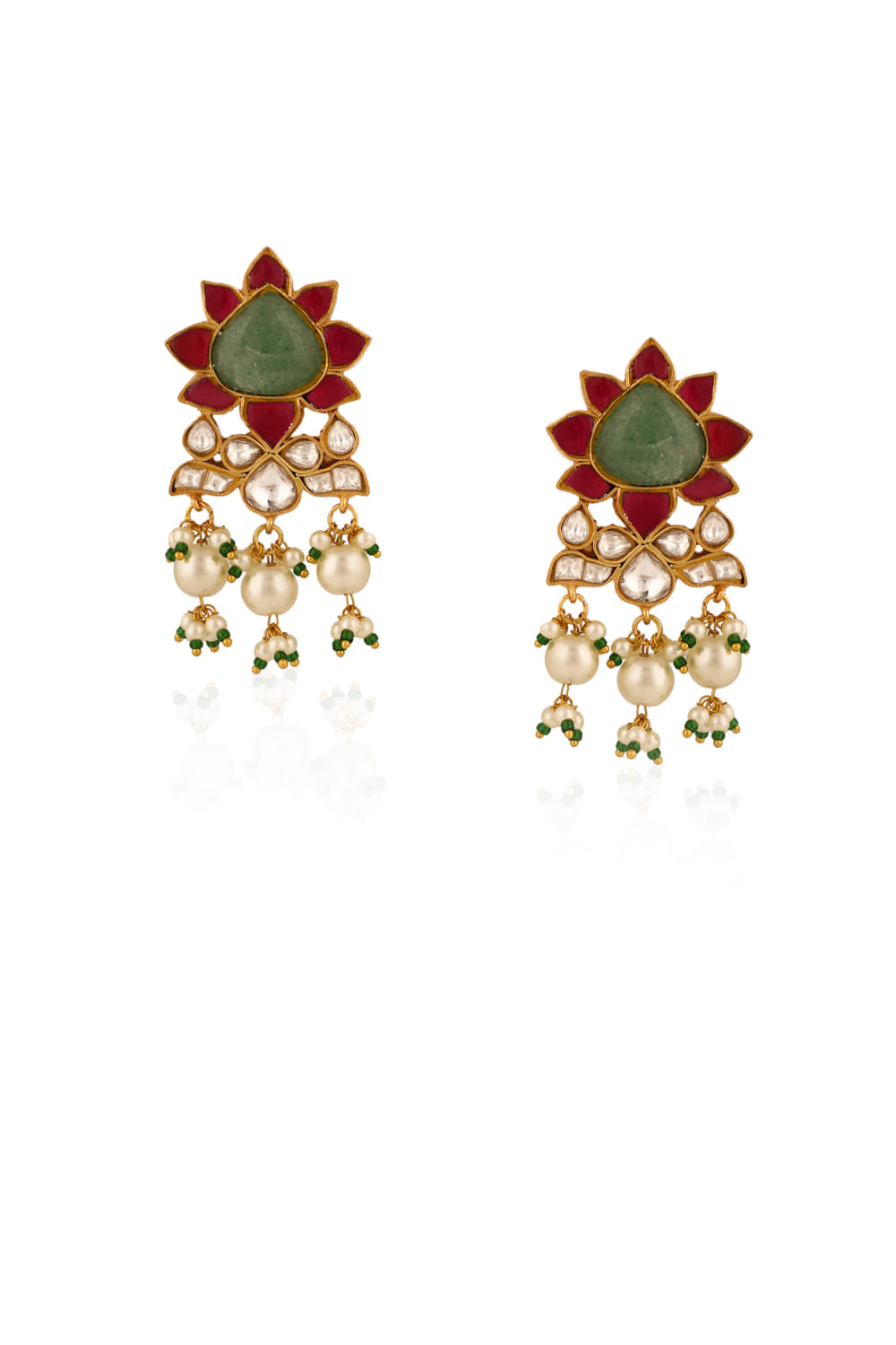 Riana Jewellery designs this splendid pair of danglers rendered in 22kt matt gold-plated silver and copper mix metal with delicate pearls, semi-precious stones, beads and jadtar stone embellishments. Style them with a woven saree for a wedding appeal.