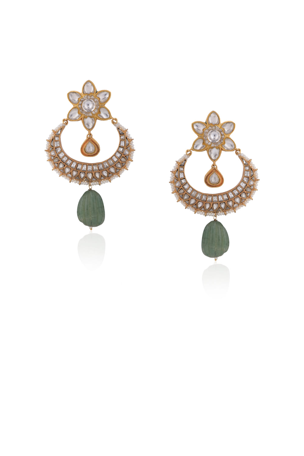 Riana Jewellery designs this opulent pair of danglers rendered in 22kt matt gold-plated silver and copper mix metal with dainty pearls, beads and jadtar stone embellishments. Style them with a sharara set for a wedding function.