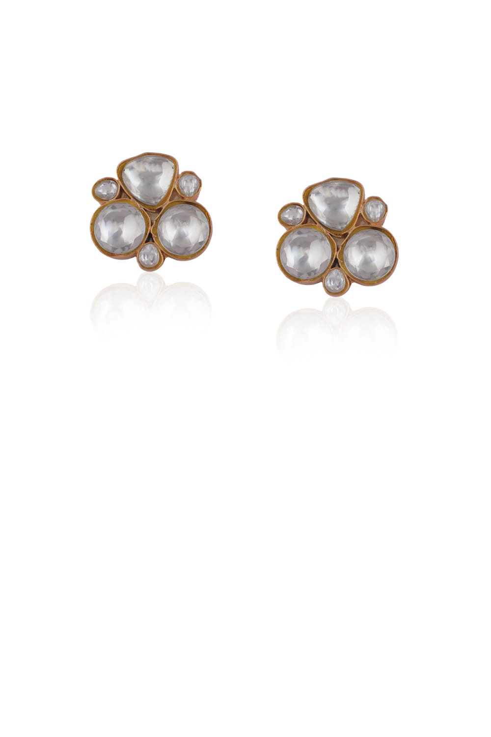 Riana Jewellery designs this contemporary pair of studs embraced in silver and copper mix metal with 22kt matt gold plating adorned with jadtar stones. Style them with a satin dress to be the model of the moment.
