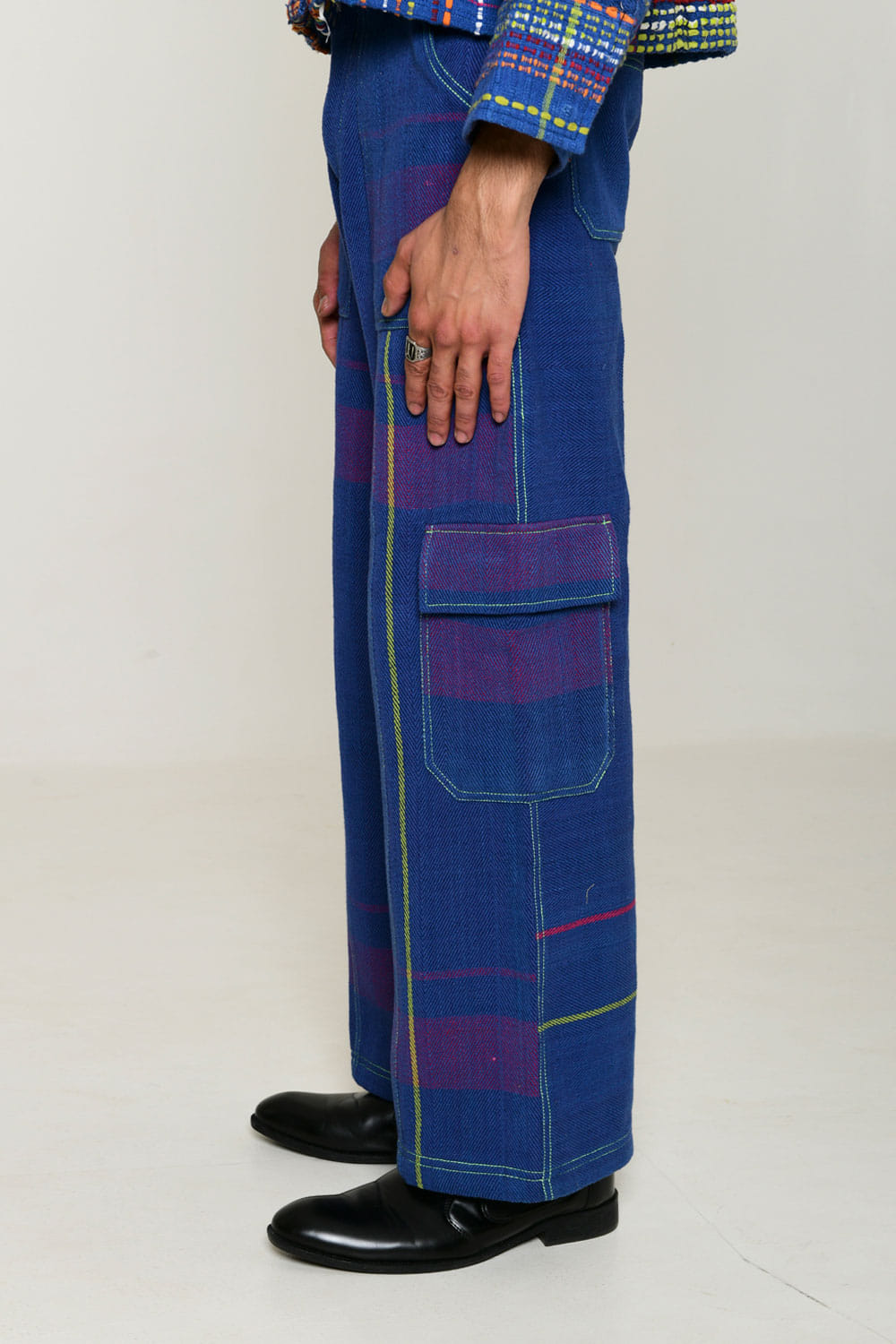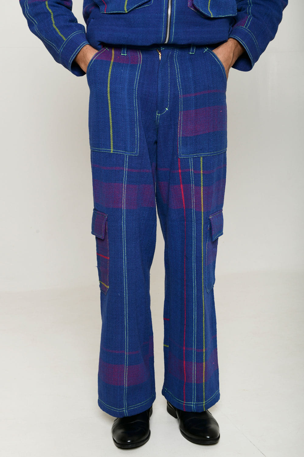 Rias Jaipur designs this wardrobe staple pair of cargo pants handwoven in recycled cotton with multicolour weft technique featuring pocket detailing. Style it with an overlay and corset top for a stylish look. The jacket here is shown for styling purposes only. Kindly note that the product is unisex.