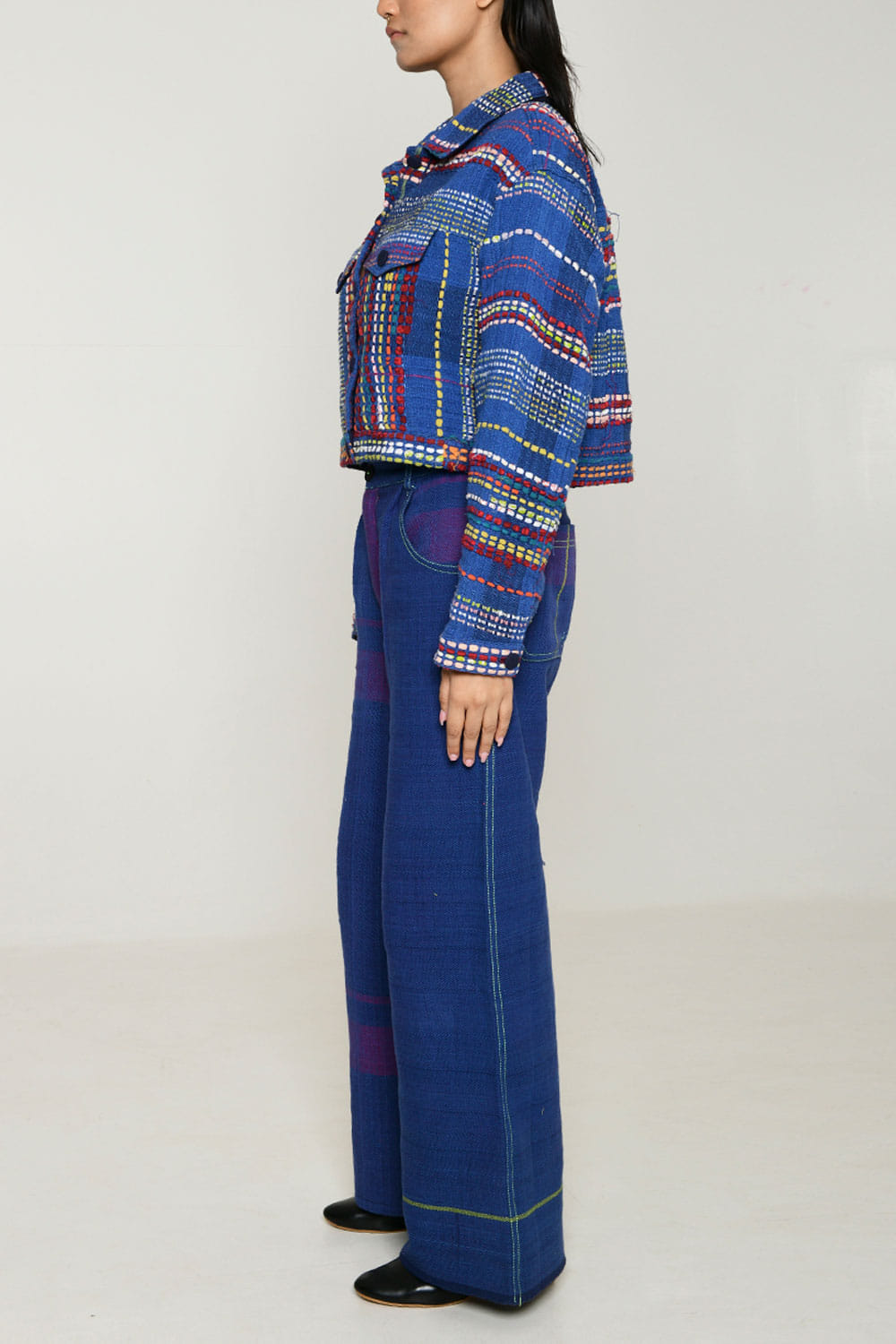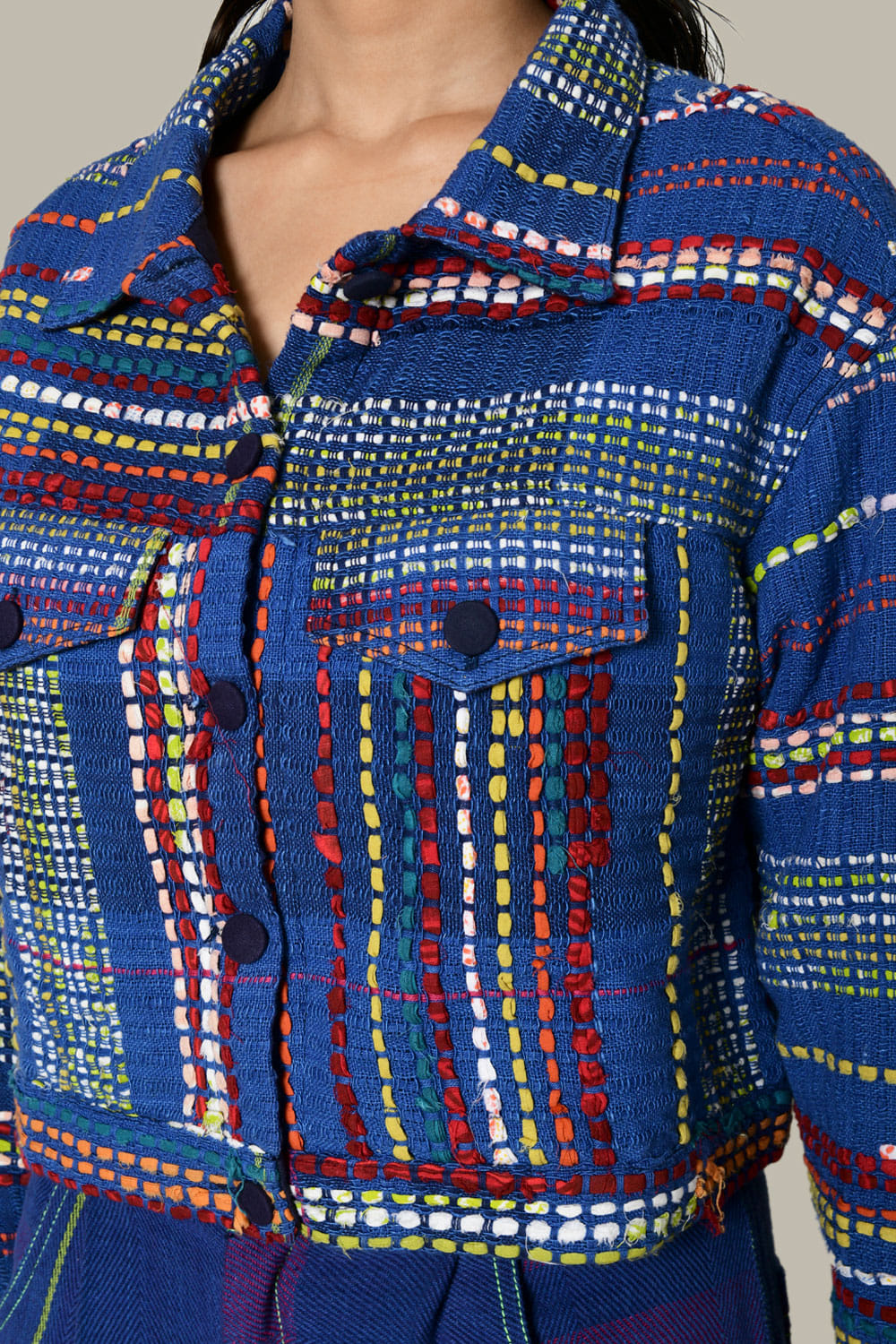 Rias Jaipur designs this trend-setting jacket handwoven in recycled cotton with multicolour weft technique featuring pocket flaps and button detailing. Style it with a palazzo and sneakers for a cool look. The pants here are shown for styling purposes only. Kindly note that the product is unisex.