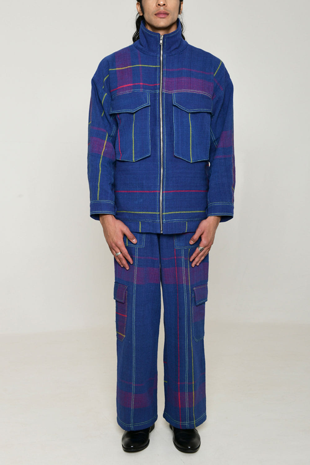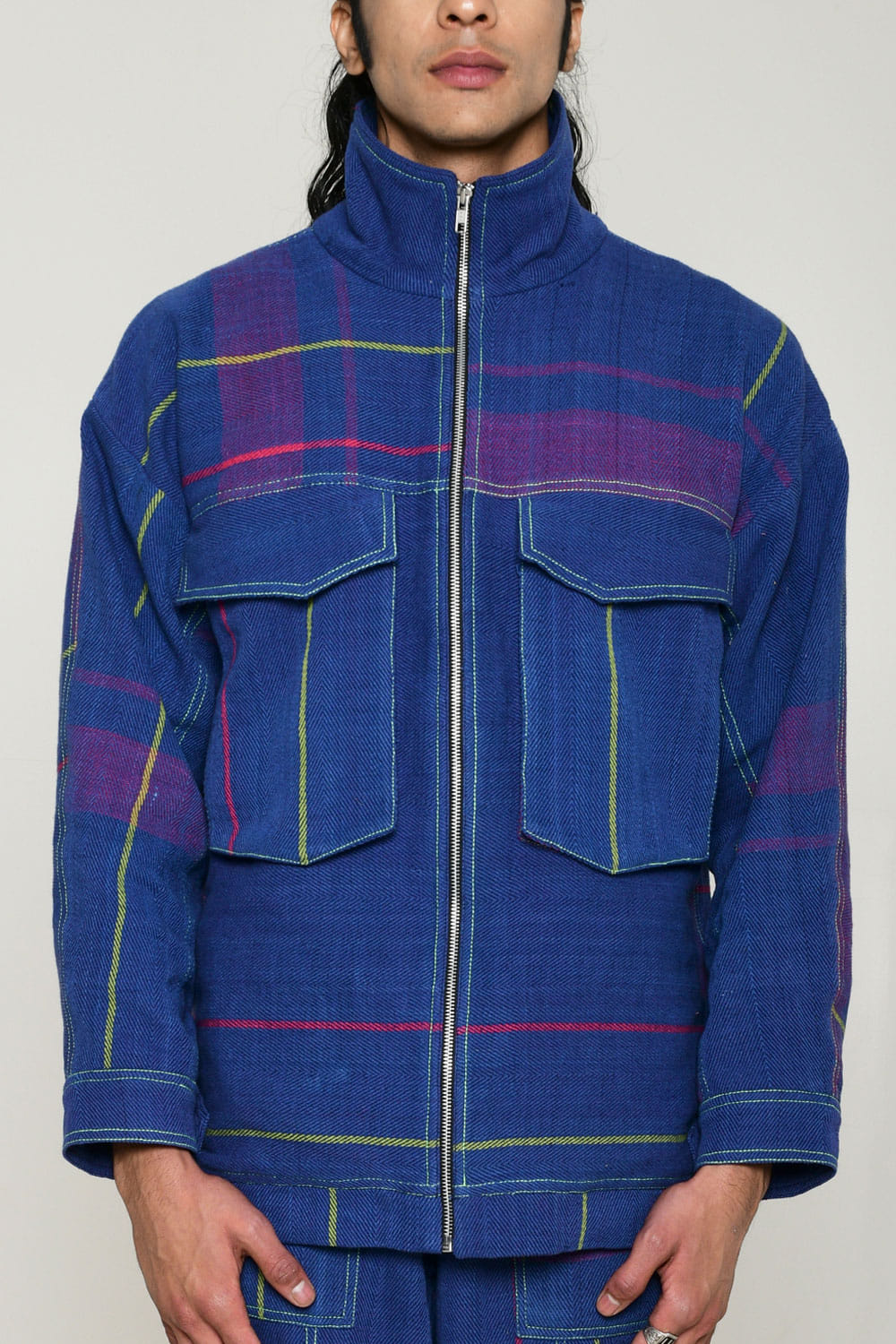 Rias Jaipur designs this timeless shacket handwoven in recycled cotton with multicolour weft technique featuring pockets and zip detailing. Style it with denim jeans and a turtle neck top. The pants here are shown for styling purposes only. Kindly note that the product is unisex.