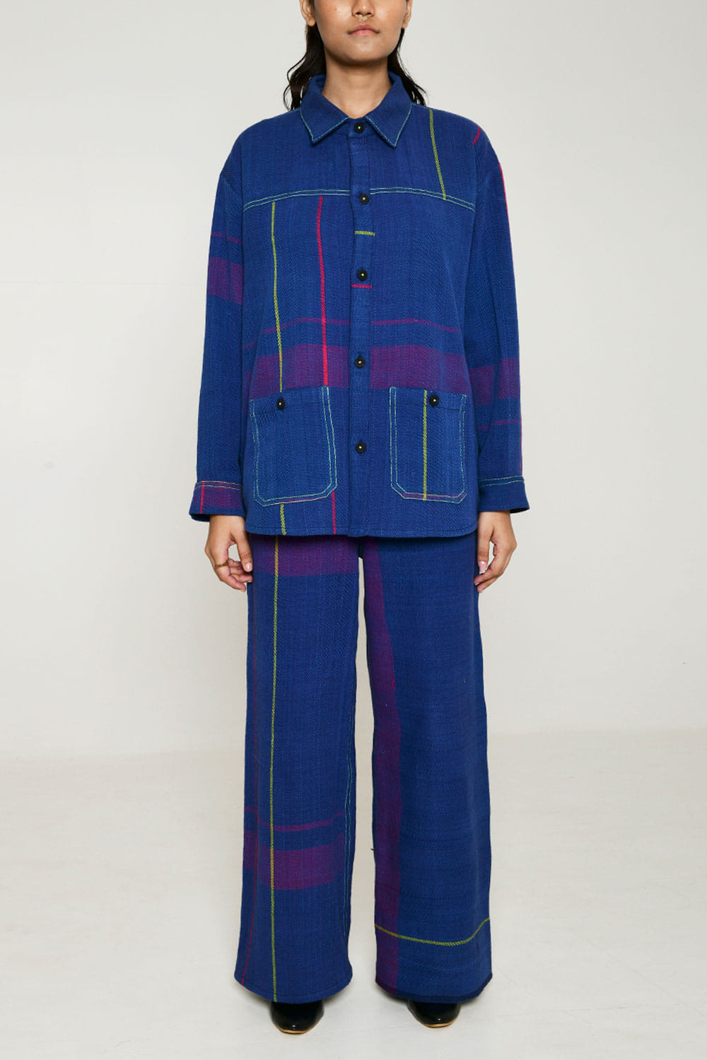Rias Jaipur designs this uber-chic shacket handwoven in recycled cotton with multicolour weft technique featuring pockets and button detailing. Style it with a bralette and a short skirt for a modern look. The pants here are shown for styling purposes only. Kindly note that the product is unisex.