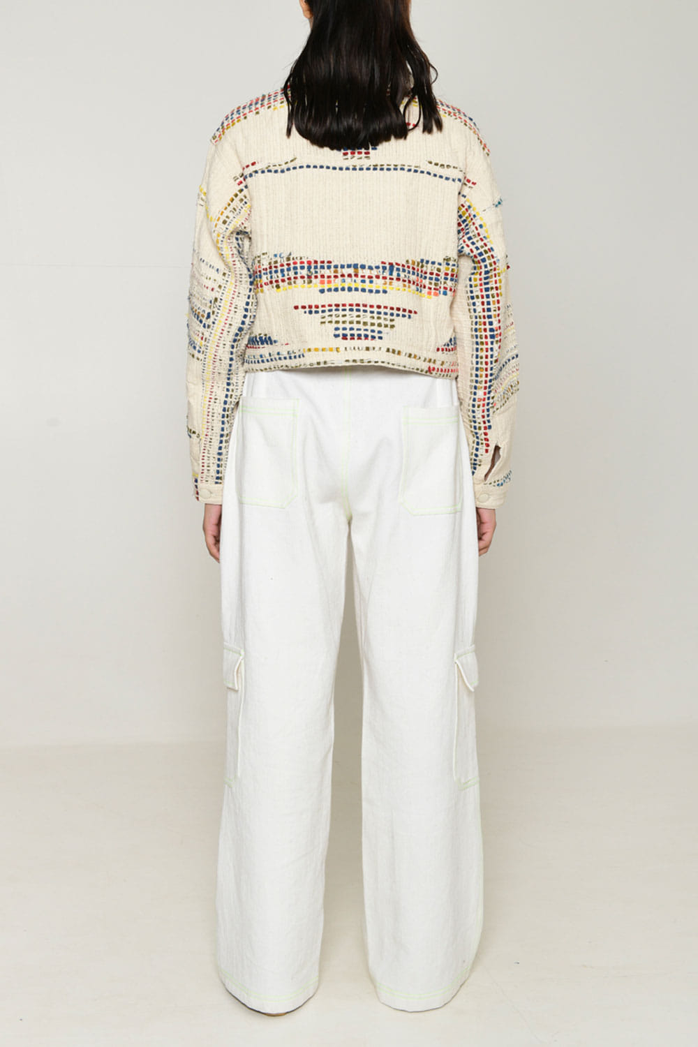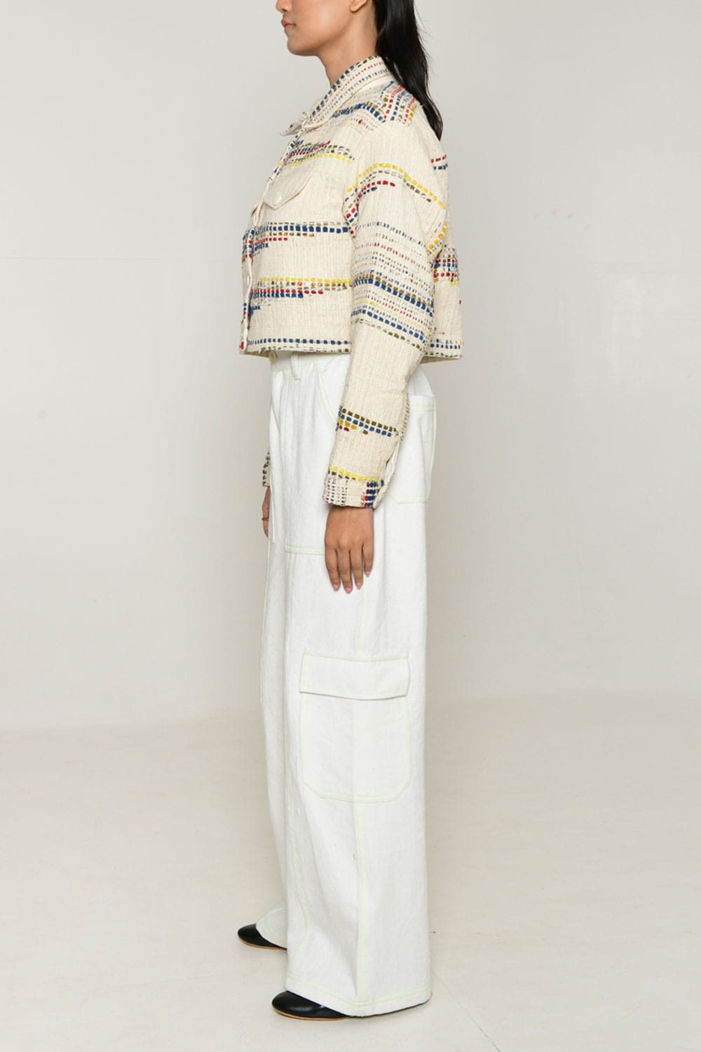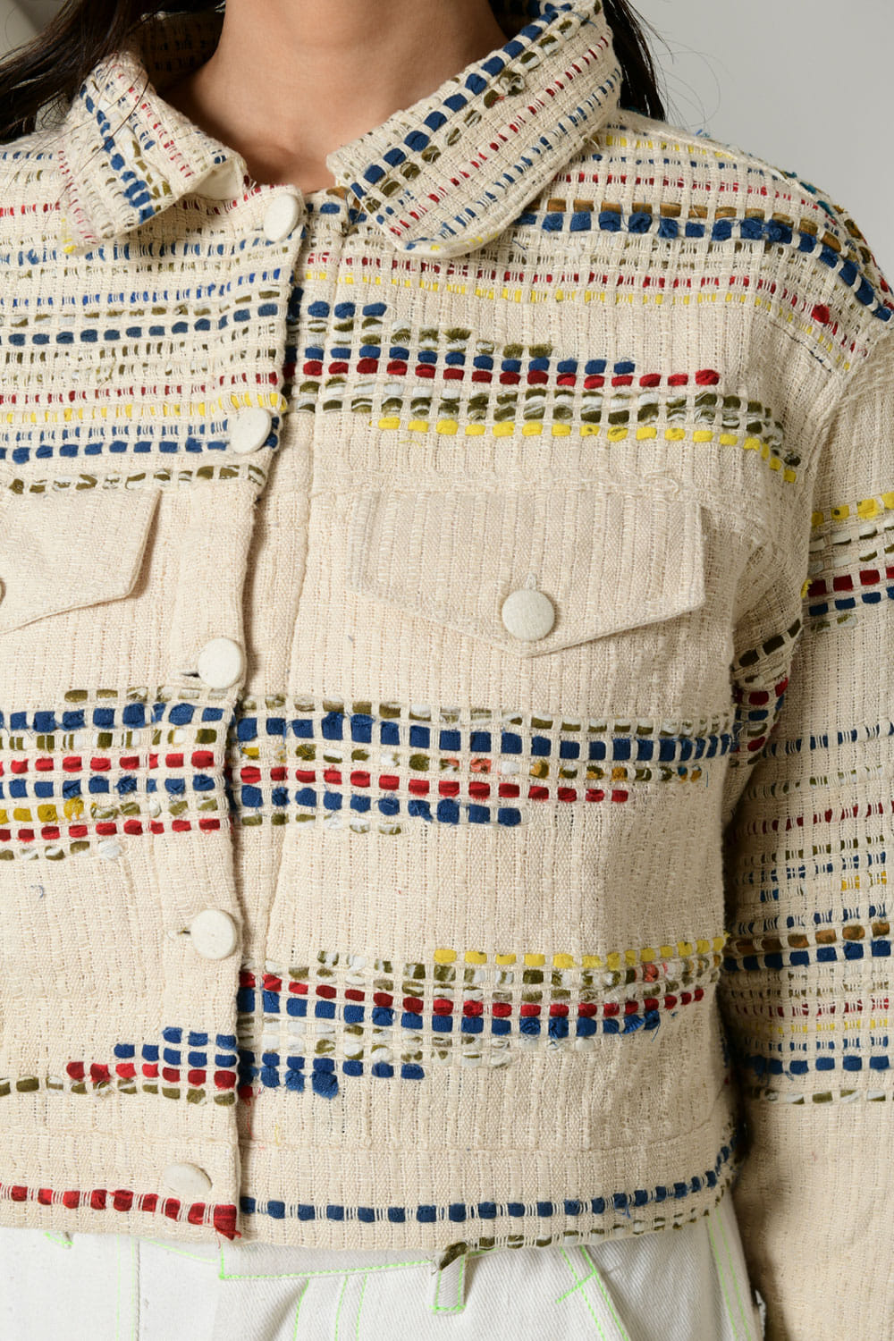 Rias Jaipur designs this idiosyncratic jacket handwoven in recycled cotton with multicolour weft technique featuring pocket flaps and button detailing. Style it with wide-leg pants and a sling bag for a brunch outing. The pants here are shown for styling purposes only. Kindly note that the product is unisex.
