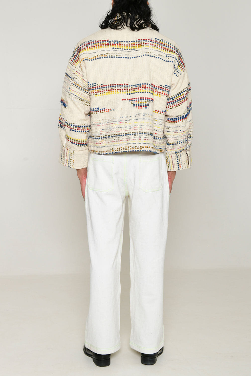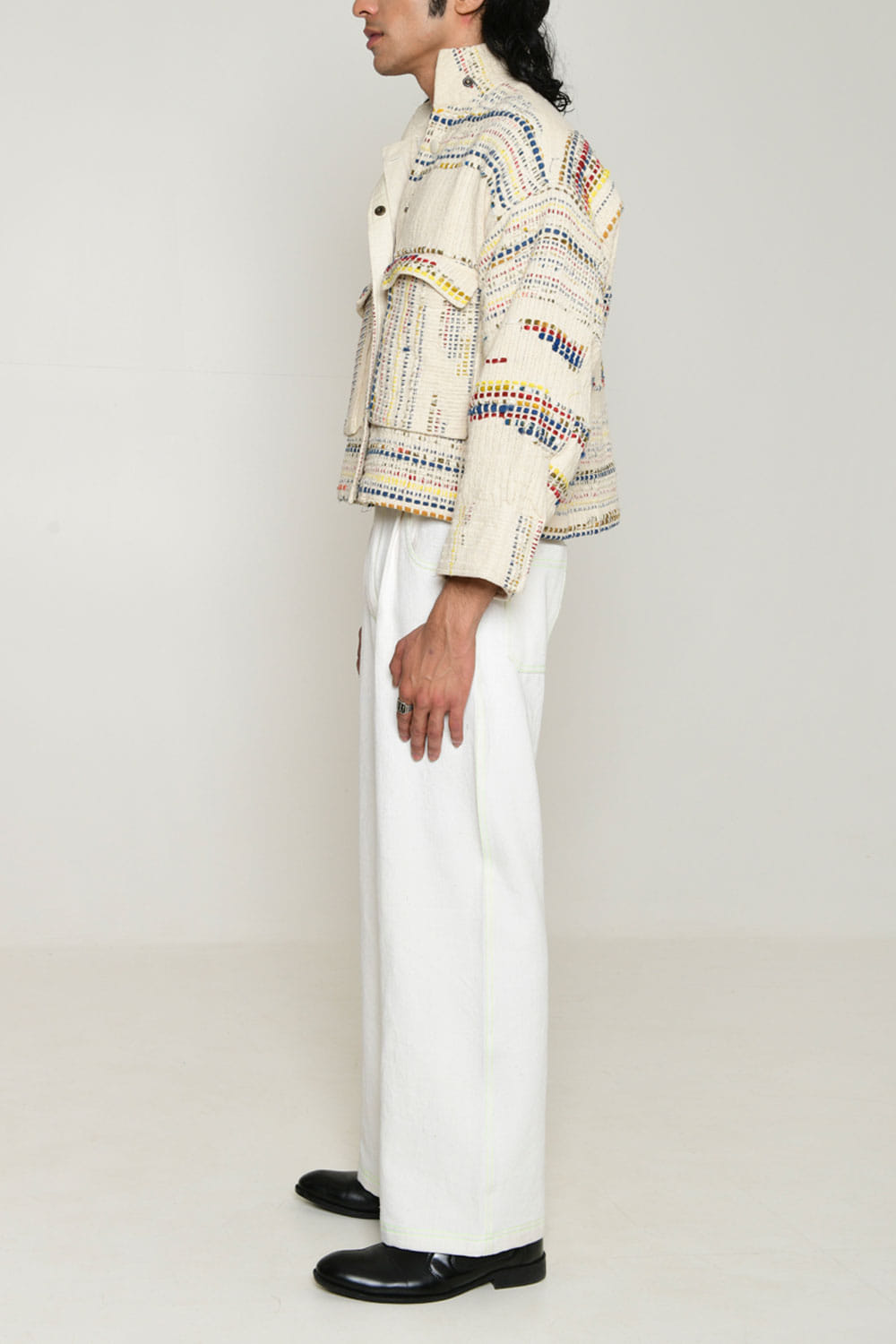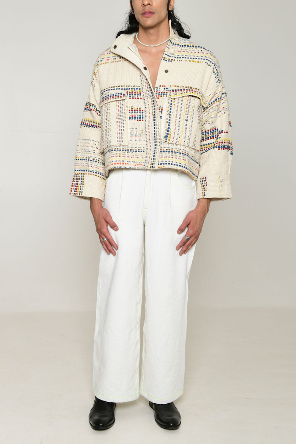 Rias Jaipur designs this dapper jacket handwoven in recycled cotton with multicolour weft technique featuring pockets and button detailing. Style it with printed pants and sneakers for a quirky look. The pants here are shown for styling purposes only. Kindly note that the product is unisex.