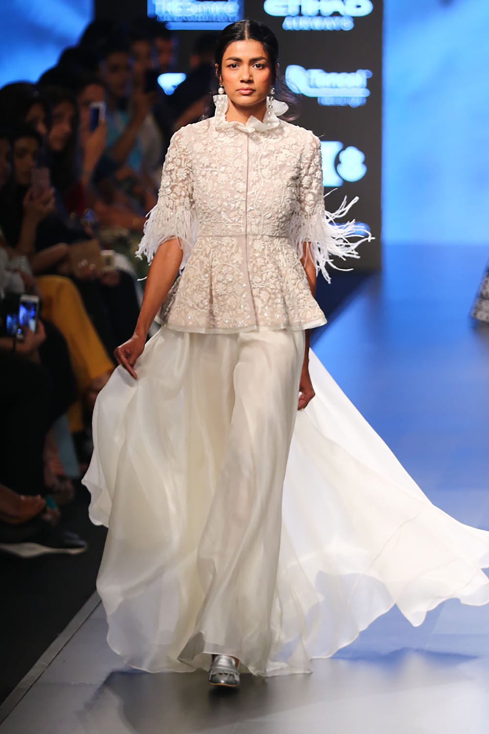 Ridhi Mehra keeps it ethereal with this embellished peplum top paired with flowy sharara pants. Style it with dull silver stilettos and pearl earrings.